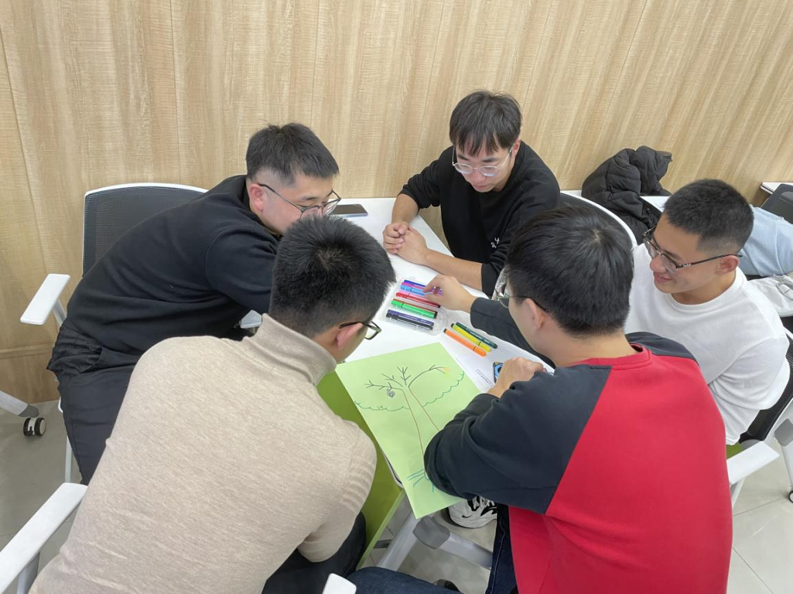 本活动由哈哈体育朋辈心理辅导员王春露主持,由公司研究生班长高宁负责收集协助组织,共有32名研究生参与此次活动。本次活动分为两个阶段。第一阶段是热身阶段,首先让大家鼓掌欢迎自己进入人生新的阶段,之后,让参与的同学们进行简短的自我介绍,增加彼此之间的熟悉感,放下戒备,让同学们进入放松的状态。第二阶段为游戏比拼阶段,将同学们分组,每个小组抽取单词卡片,经过组内商讨分工后,用身体摆出抽到的单词,增强小组内成员间的沟通合作。之后,带领大家进行“解密千千结”、“绘制团体树”的环节,并进行游戏体验和团体树概念创作理念的分享。最后,让同学分享参与此次活动的感受与收获。