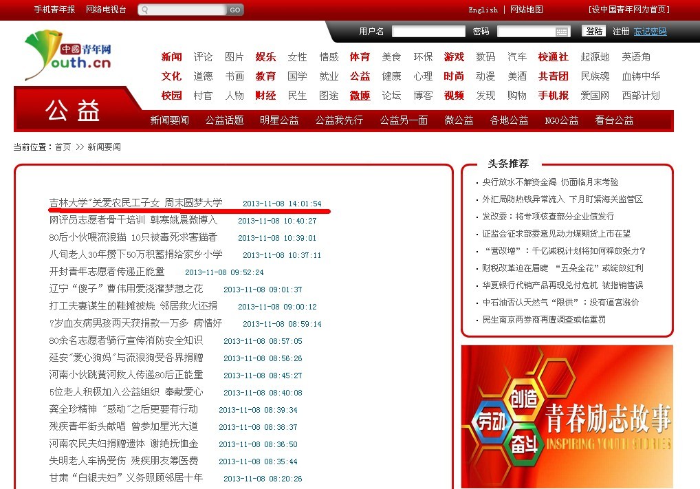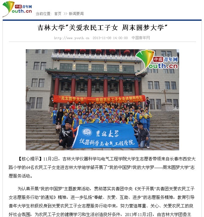 中国青年网关注报道公司“关爱农民工子女 周末圆梦大学”志愿服务活动