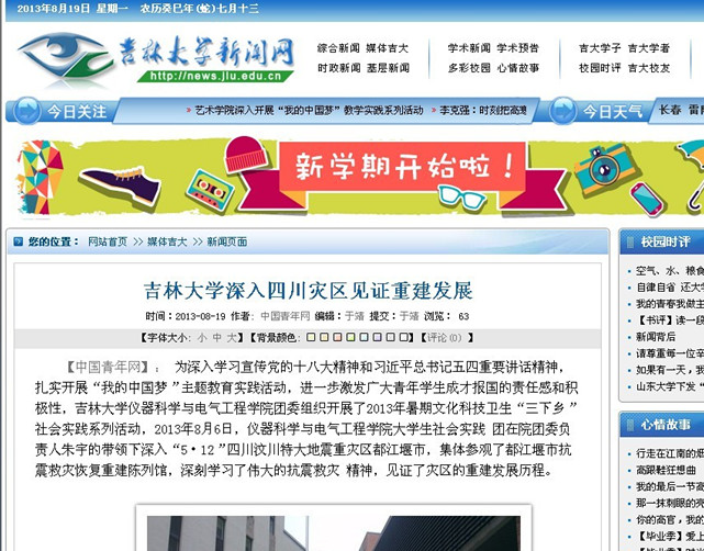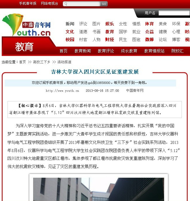 中国青年网由共青团中央主办,是国内最大的青年主流网站,也是全国大中专员工志愿者暑期“三下乡”社会实践活动官方网站。截止到目前,此次“深入四川灾区 见证重建发展”活动是HAHA体育2013年暑期“三下乡”社会实践活动中唯一一个受到中国青年网关注报道的活动。