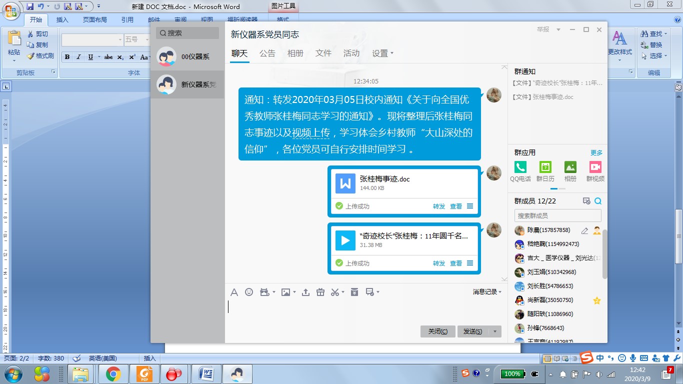 2020年03月05日校内通知《关于向全国优秀教师张桂梅同志学习的通知》,2020年3月9日上午,仪器系教师党支部开展学习张桂梅同志先进事迹活动。