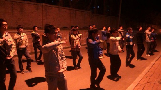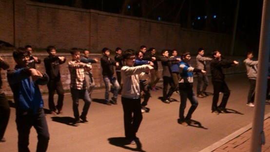 紧张有序的训练于18:30拉开序幕,次训练主要分三部分进行。第一部分是由大三专业练习太极拳多年的学长对全体同学进行动作指导,叙述动作要领,让大家对拳法步调有一个大体的了解。第二部分则是分小组各自进行练习,分别由一位同学来对大家进行动作纠正和细节上的完善。第三部分由学长带领同学们跟随音乐完整地进行几次太极拳整套动作的练习,并在练习中不断完善动作要领。每次训练持续了一个多小时,但同学们的热情却丝毫没有退减。每一次抬手,每一次曲腿,每一次转身,每一次出拳,他们都仔细琢磨,反复练习,力求做到精准到位。他们专注的眼神和认真的态度,充分显示了其对于本次训练的重视。