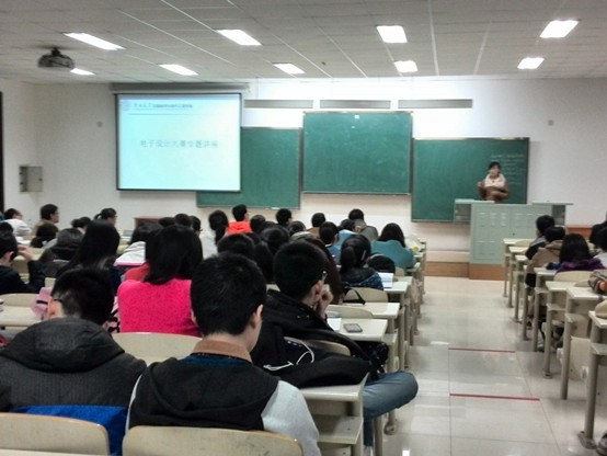 讲座,裴利然同学首先了解了2013级同学的学业情况,并以自身为例,鼓励大家努力学习、积极参与动手实践活动;此外,她向大家详细介绍了公司电子设计大赛的发展历程及公司员工近年的获奖情况;随后,她跟同学们分享了自己多次参加电子设计竞赛并取得优异成绩的经验,并鼓励大家要积极地将所学的专业知识与动手实践有机结合,她动员2013级全体同学积极参加到即将举行的校电子设计竞赛中,鼓励大家认真选题大胆创新,力争在今年的校电子设计竞赛中再创佳绩。讲座结束后,裴利然同学还耐心与2013级同学进行了交流与沟通,针对同学们提出的问题给出了宝贵的意见。