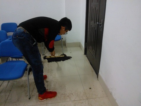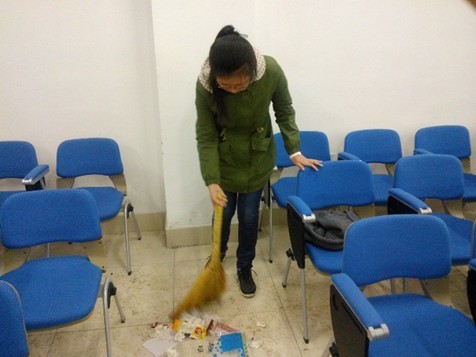 左右志愿者们来到了中心校区李四光实验楼,在负责人为大家布置好工作任务后,志愿者们便迅速投入到义务劳动中来。有的同学用扫帚细心地将垃圾扫到一起,有的同学负责拖地,剩下的同学或摆放桌椅,或擦黑板,没有人嫌脏,没有人说累,大家干得热火朝天,经过两个多小时的奋斗,实验室终于变得干净整洁。看着满满的垃圾袋,大家都开心地笑了,最后大家合影留念,圆满的结束了这次忙碌但有意义的志愿服务活动。
