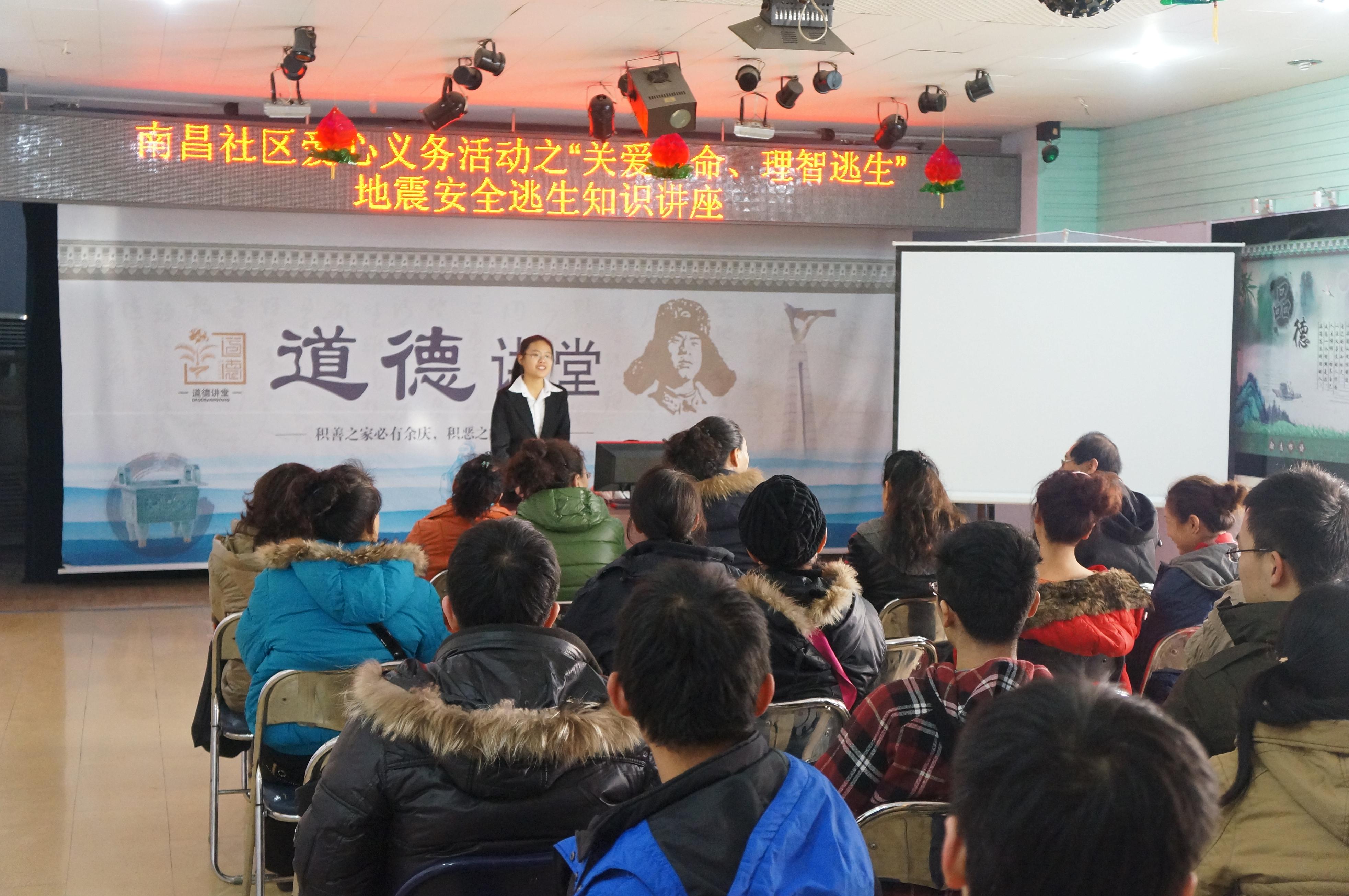由于前段时间吉林省松原地区地震频发,给长春市清和街道社区居民尤其是老年居民的日常生活带来干扰和不便,为了给居民普及地震安全预防知识,引导广大社区居民理智应对地震,哈哈体育团委于2013年12月4日组织40余名老员工志愿者走进朝阳区清和街道南昌社区开展了以“关爱生命、理智逃生”为主题的地震科普知识讲座。
