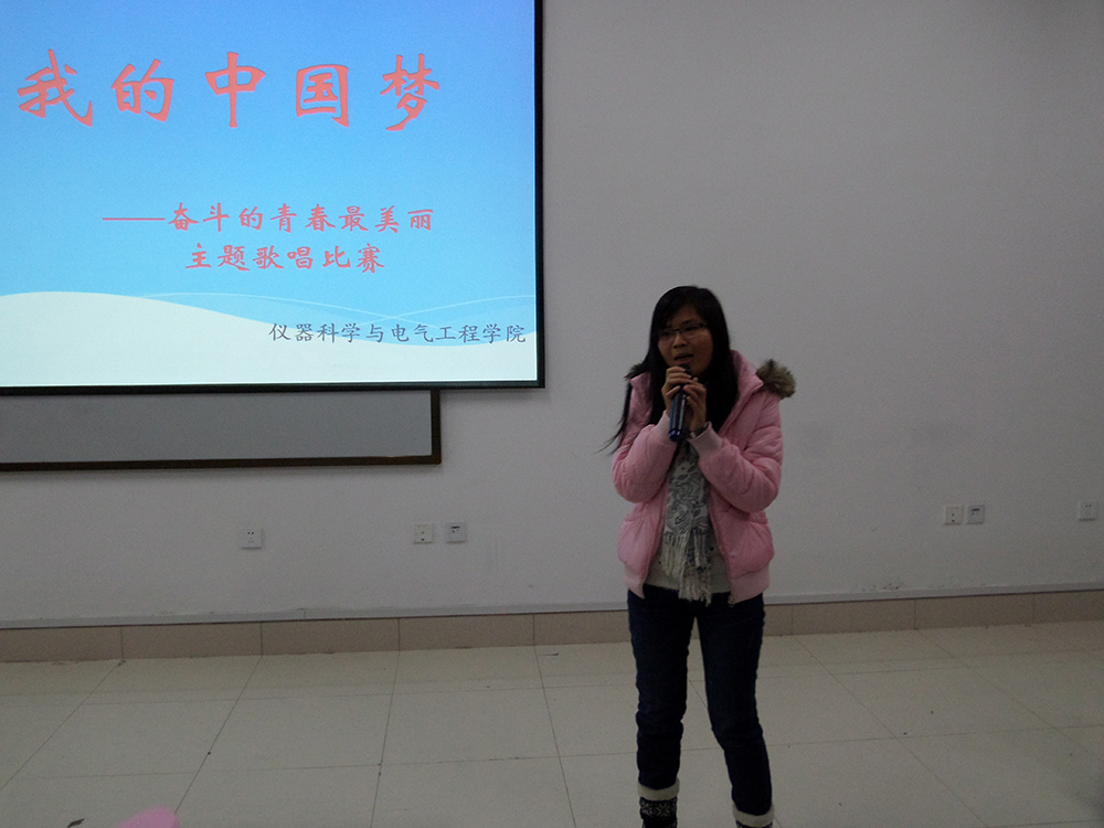 当天18:00,主持人宣布比赛正式开始,全场掌声雷动。首先,651101班团支部崔贞淑同学出场,她以一首《爱要坦荡荡》瞬间点燃全场激情,欢快的节奏,起伏的音调,带领每位同学徜徉在青春中最美的情感里。大一的学妹实力雄厚,学长学姐们自然也不甘示弱,先是2012级陈佳宜同学以其独特的嗓音献唱一首《最初的梦想》,紧扣主题、发人深省;随后,2012级才凯龙同学更是用难度极高的一首《as long as you love me》征服全场观众,把整场比赛推向高潮。当一切音符停止跳动,当大家还沉浸于刚才的喧嚣,董子健同学缓缓地把所有人的目光汇聚在他的身上,一首《童话》,曾经那个年代里令无数少年为之疯狂的抒情神曲,曾经那首脍炙人口的爱情誓言,在如今的大公司园响起,被新一代青年唱响,看似爱情,实则升华为对人生、对祖国的浓烈感情。观众的屏息倾听后是震耳欲聋的掌声。接下来,别具特色的嗓音为全场呈现别样精彩,同时把比赛带入尾声。任伟同学的一首《草原上升起不落的太阳》,空旷的草原上有人放声高歌,歌颂的是英明的领导,更是美好的生活,赞扬着“中国梦”,传承着“中国梦”,更激励着广大青年学子不断奋斗去实现伟大“中国梦”!
