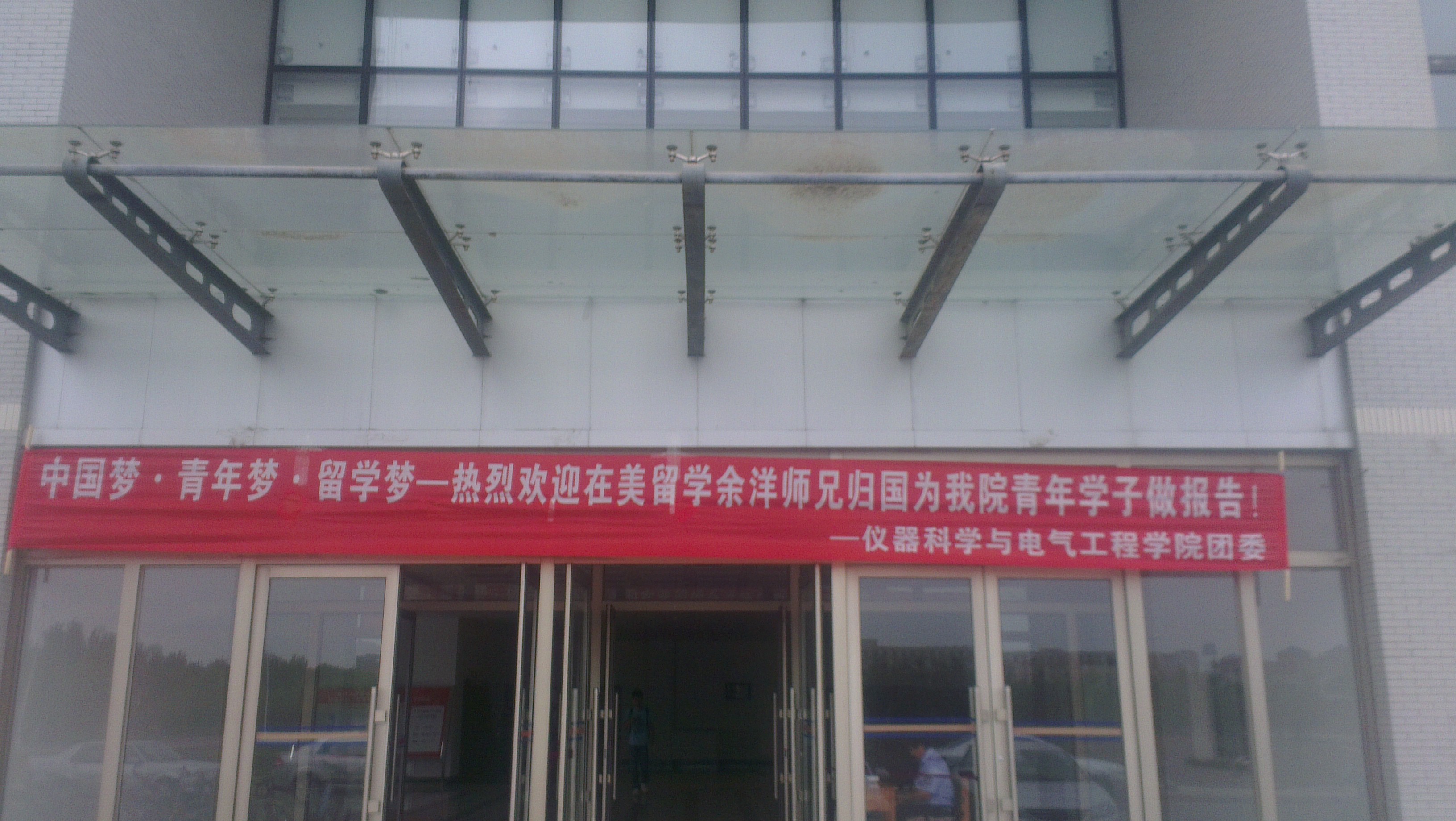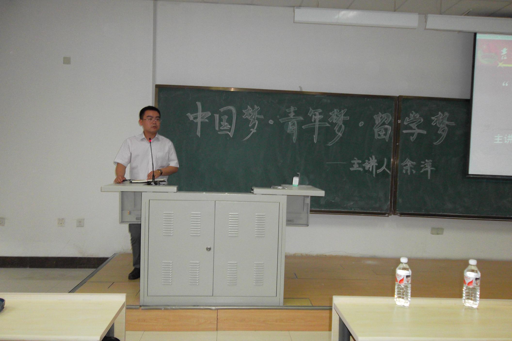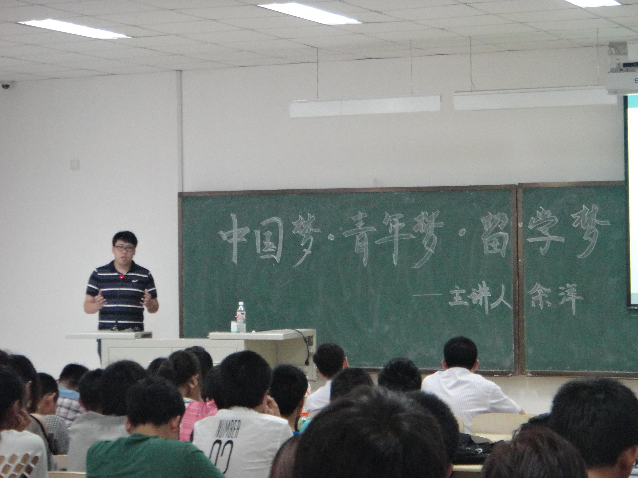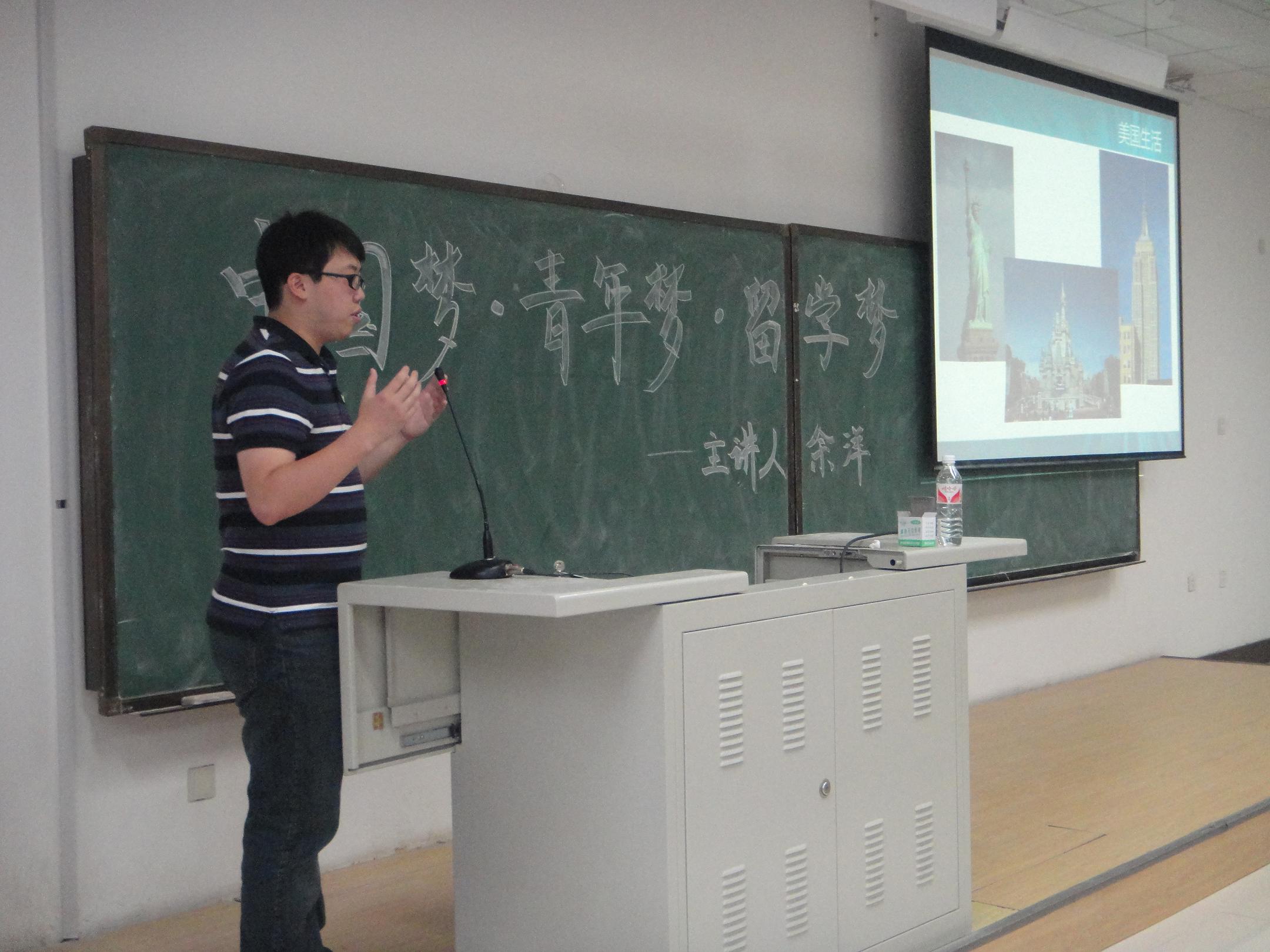 在讲座上,余洋同学热情真诚地与学弟学妹们就国外研究生申请以及大学学习生活规划两方面问题进行了交流和分享。针对目前不少同学有出国留学的想法和计划的情况,余洋就申请国外研究生的具体流程进行了详细讲解,具体从决定、考试、选校、申请、递交材料、签证、中介以及关于出国的误区进行了说明。他强调大家要清楚认识出国的意义其实是“自身的投资”,是为了未来更好地奋斗;为了生动具体地讲解留学申请过程,余洋还“独具匠心”地以网络申请世界著名的哈佛大学流程为例,为大家进行了具体演示。在讲座中,余洋始终强调英语学习和专业学习的重要性,并反复强调“奋斗”精神对青年的重要性,他鼓励大家在大学期间要坚定目标、努力学习、认真钻研、不断创新。此外,余洋结合自身实际为大家介绍了国外公司产品体制与国内的差别。最后,他鼓励大家树立明确的学习目标并坚持不懈地为之奋斗,勉励大家要珍惜老员工活,培养自己的爱好,努力学习,为自己的“成才梦”和伟大的“中国梦”而不懈奋斗。整场讲座,余洋用亲近平和而又不失幽默的语气娓娓道来,其精彩的讲解赢得了在场同学阵阵热烈的掌声。最后,朱宇对整场讲座进行了总结,在肯定余洋同学所取得优秀成绩的同时,朱宇对他真诚耐心地为学弟学妹们答疑解惑、分享经验表达了感谢。朱宇同时指出,青年员工不应只是幻想未来,应该在树立个人理想的基础上,拥有伟大的梦想,因为梦想比理想更加远大而神圣;当代青年作为未来祖国建设和发展的接班人,应该培养“胸怀天下、敢于担当”的品质,努力将个人成才梦想融于到“中国梦”的伟大实践进程中,并为之坚持不懈、努力奋斗。