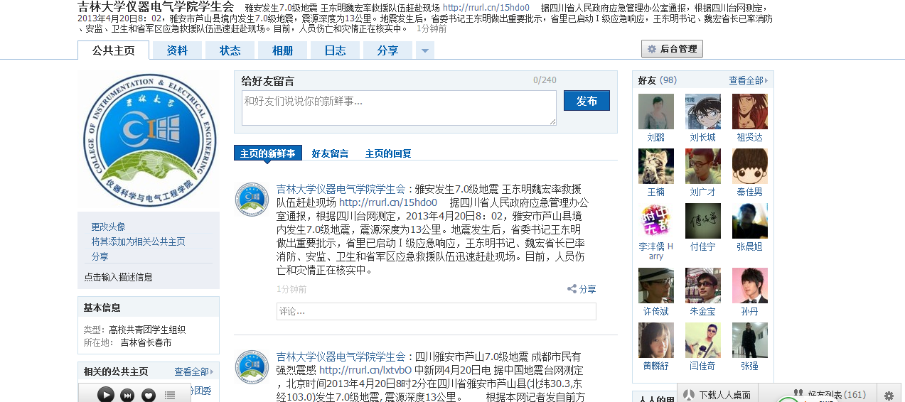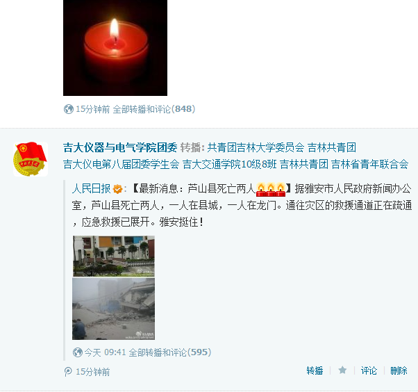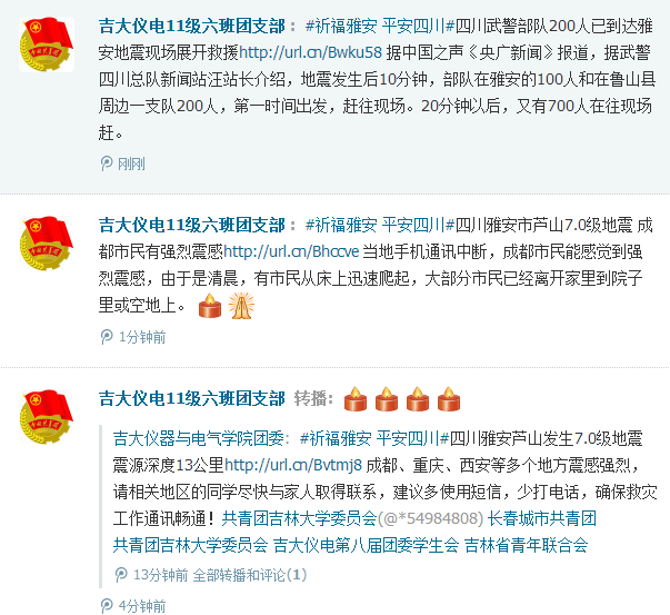 2013年4月20日上午8点左右四川省雅安市芦山县发生7.0级地震, 震源深度13公里,成都、重庆、西安、贵阳等地都有不同程度震感,芦山老县城一大批旧瓦房几乎全部倒塌,截止该日上午11:30已有30人遇难,四川省地震局初步统计伤亡人数将上百人。灾情牵动着全国人民的心,也牵动着青年员工的心。在获知地震灾情后,哈哈体育团委运用微博、人人网等新媒体工具第一时间向公司青年师生发布灾区信息,各班级团支部利用微博等关注灾情,广大青年员工在网络上第一时间向四川雅安地震灾区传递祝福。