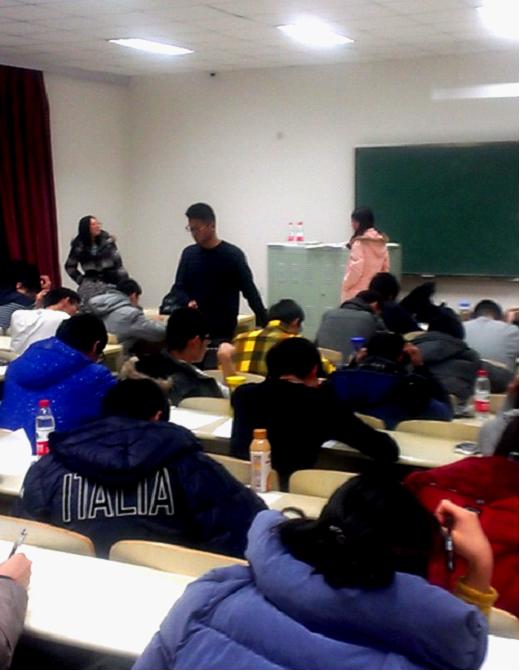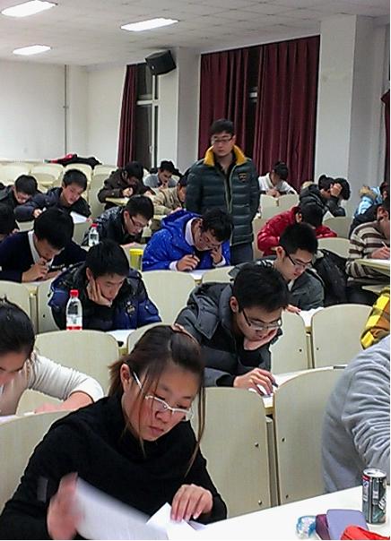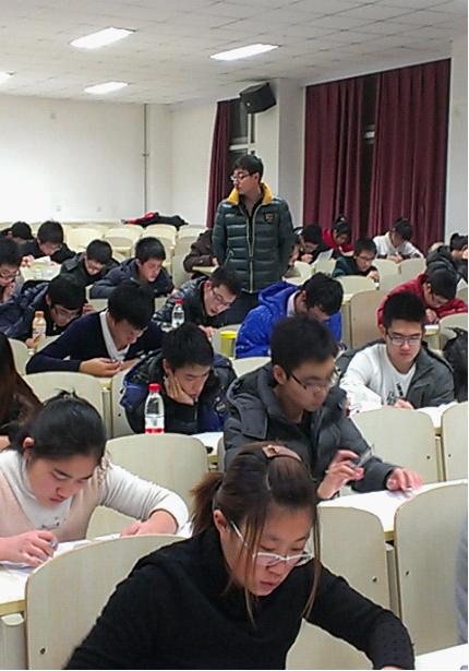 为更好地组织期末考试,2012年12月15日晚18:00时,哈哈体育分团委员工会学习部组织2012级新生在中心校区李四光进行期末模拟考试2012级辅导员蔡印老师员工会各部部长来到考场进行监考工作。