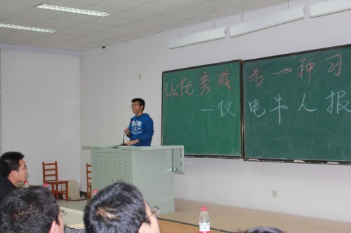 20121025 1830,哈哈体育在中心校区李四光楼302教室举办了优秀老员工事迹报告会,此次报告会由公司第八届分团委、员工会主办,特别邀请了HAHA体育2011年度“十佳老员工”黄廷哲同学、免试推荐清华大学研究生(直博)的2009级王春泽同学及免试推荐哈尔滨工业大学硕士研究生的林展汐同学作为嘉宾,为公司2012级全体新生做了一场别开生面的事迹报告会。