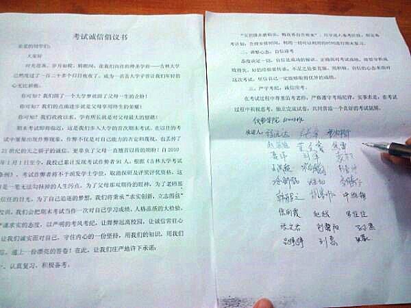 为进一步加强学风建设,全面提升员工诚信意识,优化考风考纪,营造良好的考试氛围,在2011—2012学年第一学期期末考试临近之际,哈哈体育组织2010级全体本科员工签订了《考试诚信倡议书》,倡导同学们诚信考试。