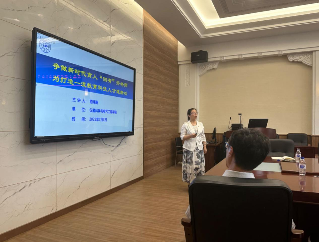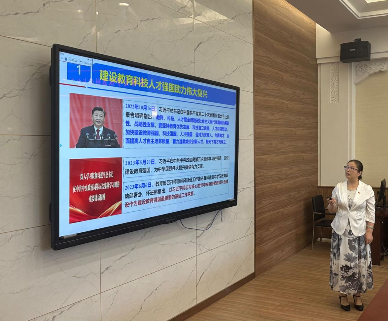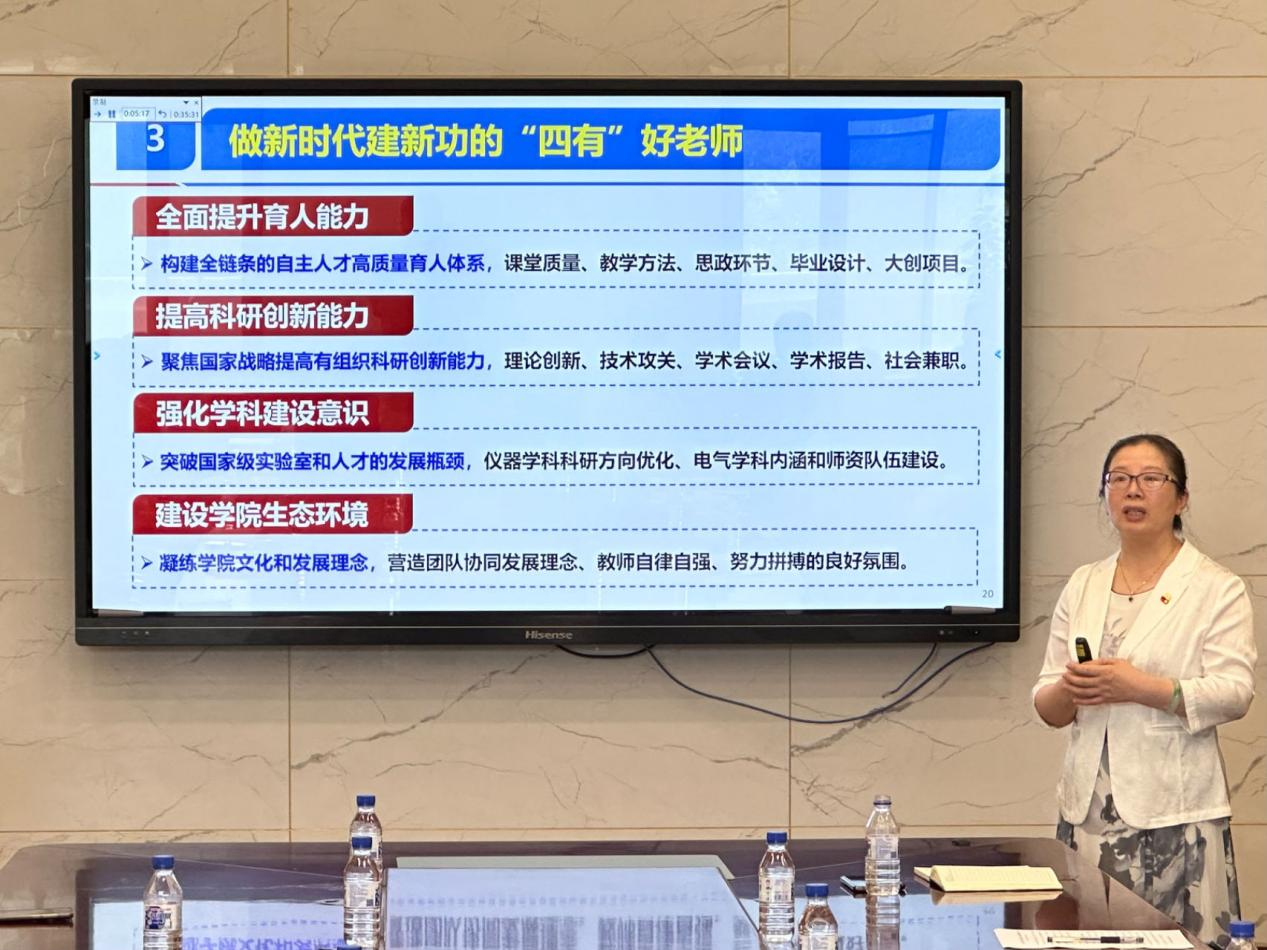 为深入开展学习贯彻习近平新时代中国特色社会主义思想主题教育,落实“学思想、强党性、重实践、建新功”的总要求,全面提高教师思想政治素质和职业道德水平,7月3日下午,在中国共产党成立102周年之际,哈哈体育经理嵇艳鞠教授以“争做新时代育人‘四有’好老师,为打造一流教育科技人才建新功”为题为全院教师党员讲授专题党课,公司全体领导班子成员参加了党课学习,公司主题教育第5指导组组长王爱民同志到会指导。