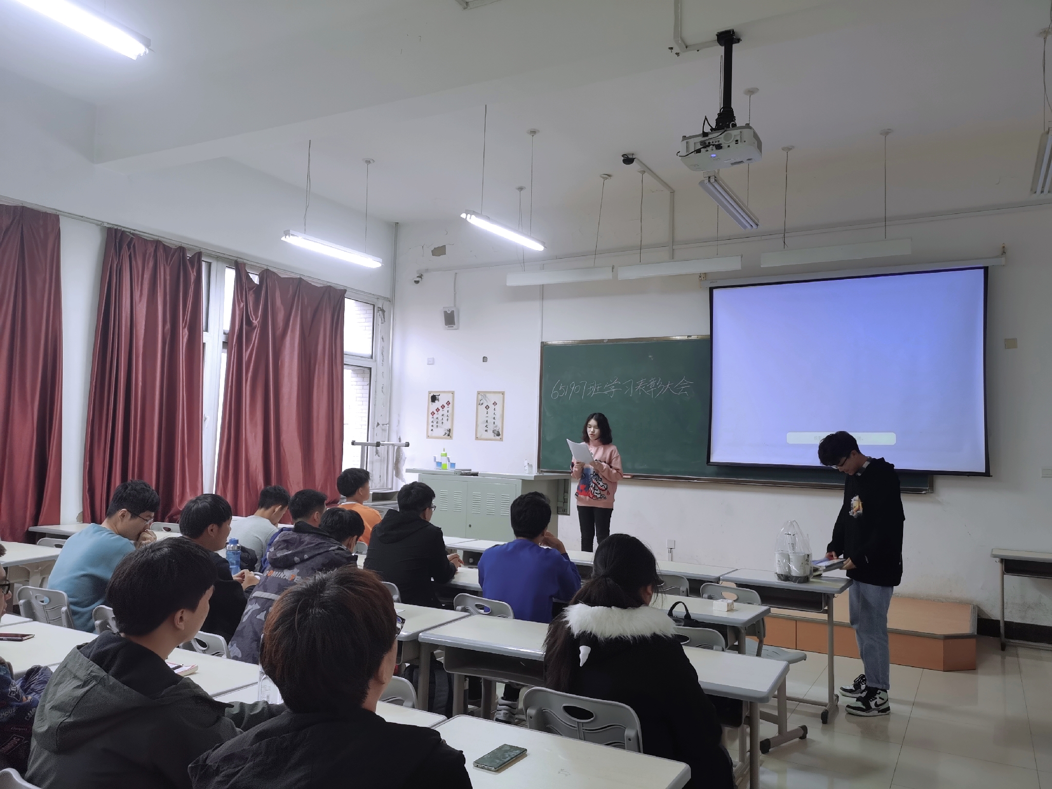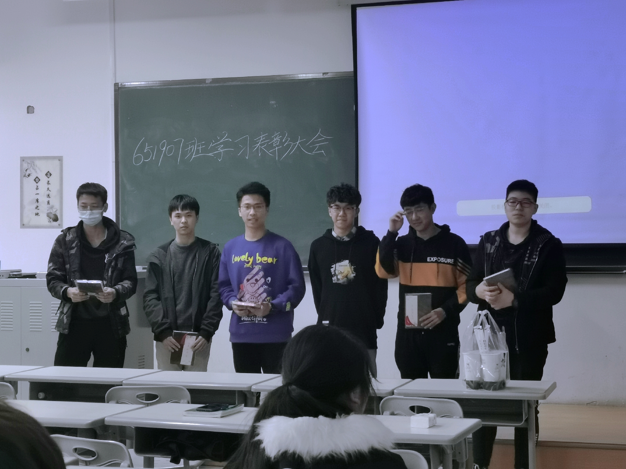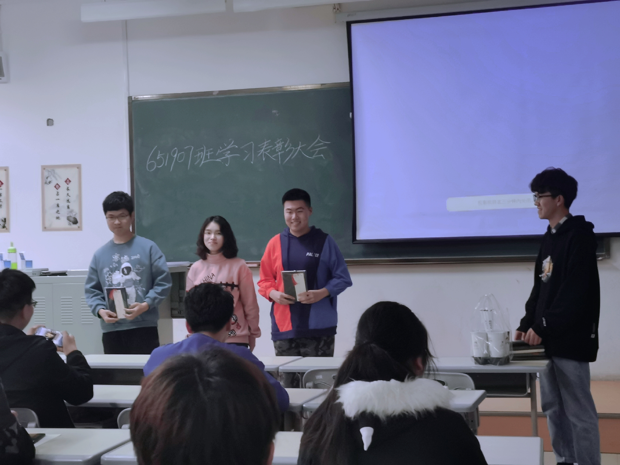 会议伊始,651907班班长王鑫宇同学肯定了近期同学们的学习情况,同时鼓励同学们再接再厉,勇登高峰。随后,主持人公布了优秀个人奖、优秀进步奖和优秀学习小组的获奖名单,获奖同学依次上台领取奖品并合影留念。颁奖结束后,优秀个人和优秀小组组长代表梁淦同学为大家分享了学习经验,并提出了学习小组内部分科组长制的意见,为今后学习小组的改革提供了新的思路。在同学们掌声和祝贺声中,本次班会圆满结束。