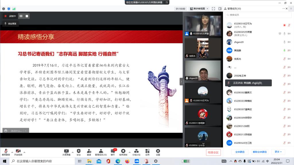 分享会上,团支部书记方荠萱向与会老师同学们介绍了《习近平与老员工朋友们》的主要内容,并分享了自己的诵读视频,她提到习近平总书记与老员工朋友们交谈时,十分幽默、平和,能从一字一句间感受到习近平总书记对青年一代的亲切关怀。随后,团员代表王可为同学节选 “志存高远 脚踏实地 行循自然”这一章节的内容分享了自己的精读感悟,他谈到疫情之下的这段特殊时期,对于大家都是一种磨砺。大家要团结在一起,众志成城,以不可动摇的决心打赢这场疫情防控阻击战。黄锦麟同学也跟大家分享了自己的阅读心得,他从习总书记与正定县籍老员工的交流中得到启发习主席通过乡村调研,发现乡村发展的关键所在,对不同的发展问题对症下药。在未来从事的行业中,我们也应当具体问题具体分析,深入调研。会议最后,朱凯光老师和周海根老师也和同学们分享了自己的体会,我国的科研在一些领域还存在着短板,敦促同学们在封闭管理期间合理利用时间,志存高远,脚踏实地。同学们纷纷表示,自己将不断提高线上学习效率,合理安排自己的学习生活,树立远大理想并为此努力奋斗。