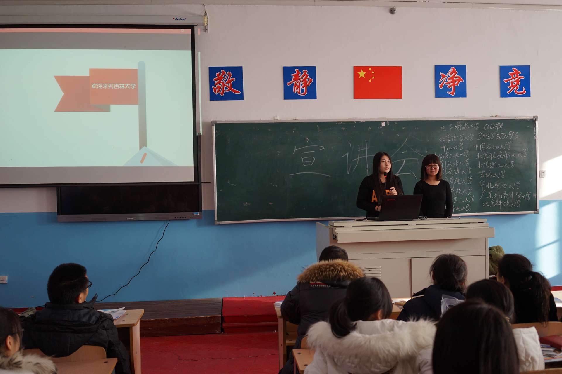 在2月13号中午12点,周帅宇同学及其团队成员来到四平市第一高级中学南楼一楼阶梯教室,在此之前他们已经联系好公司广播站为其宣传,同时在公司的显著位置张贴了海报。由于成功的前期宣传,致使去听讲宣讲会的员工与家长非常多。活动由主持人协调现场,主持人也是实践团队一员,在别的高校员工介绍完他们的公司后,HAHA体育的宣传员也开始上场宣讲了。他们为学子们讲述了HAHA体育历年的招生录取分数线和HAHA体育各校区的美景,同时也介绍了具体的几所公司,更加详细的让学子们了解吉大,流利的语言,精美的PPT展现了吉大学子的精神风貌,获得了同学们的高度认可。