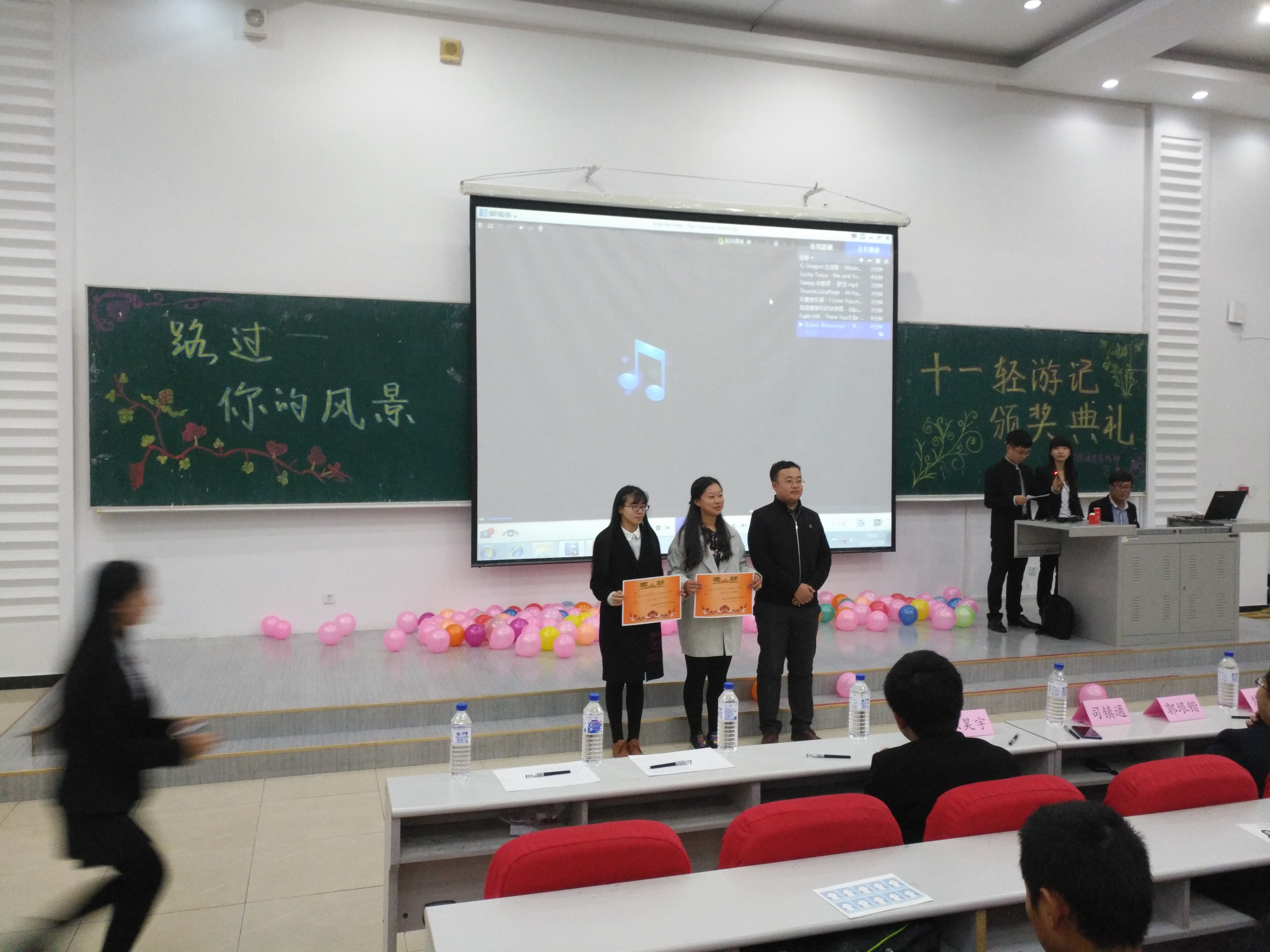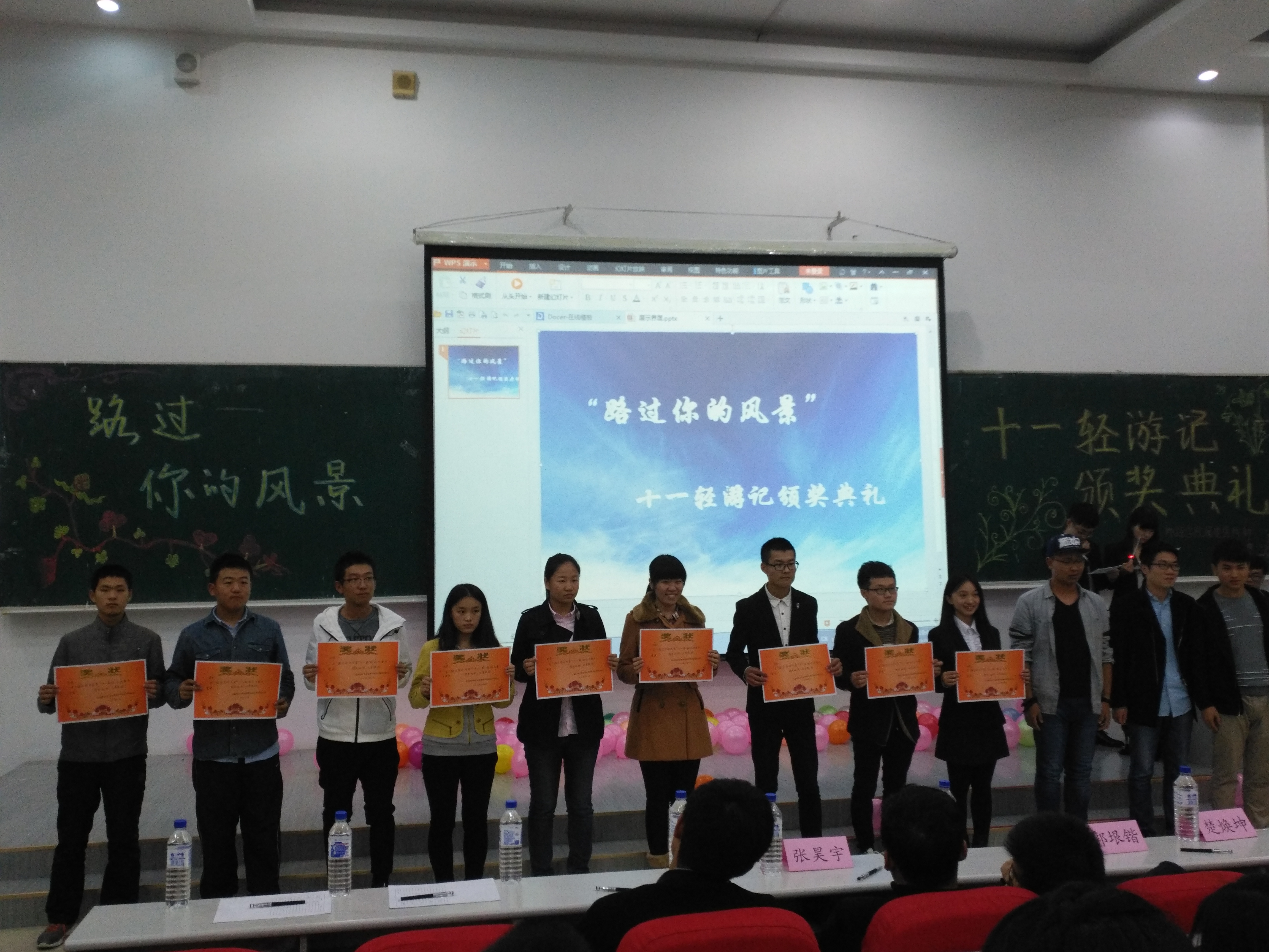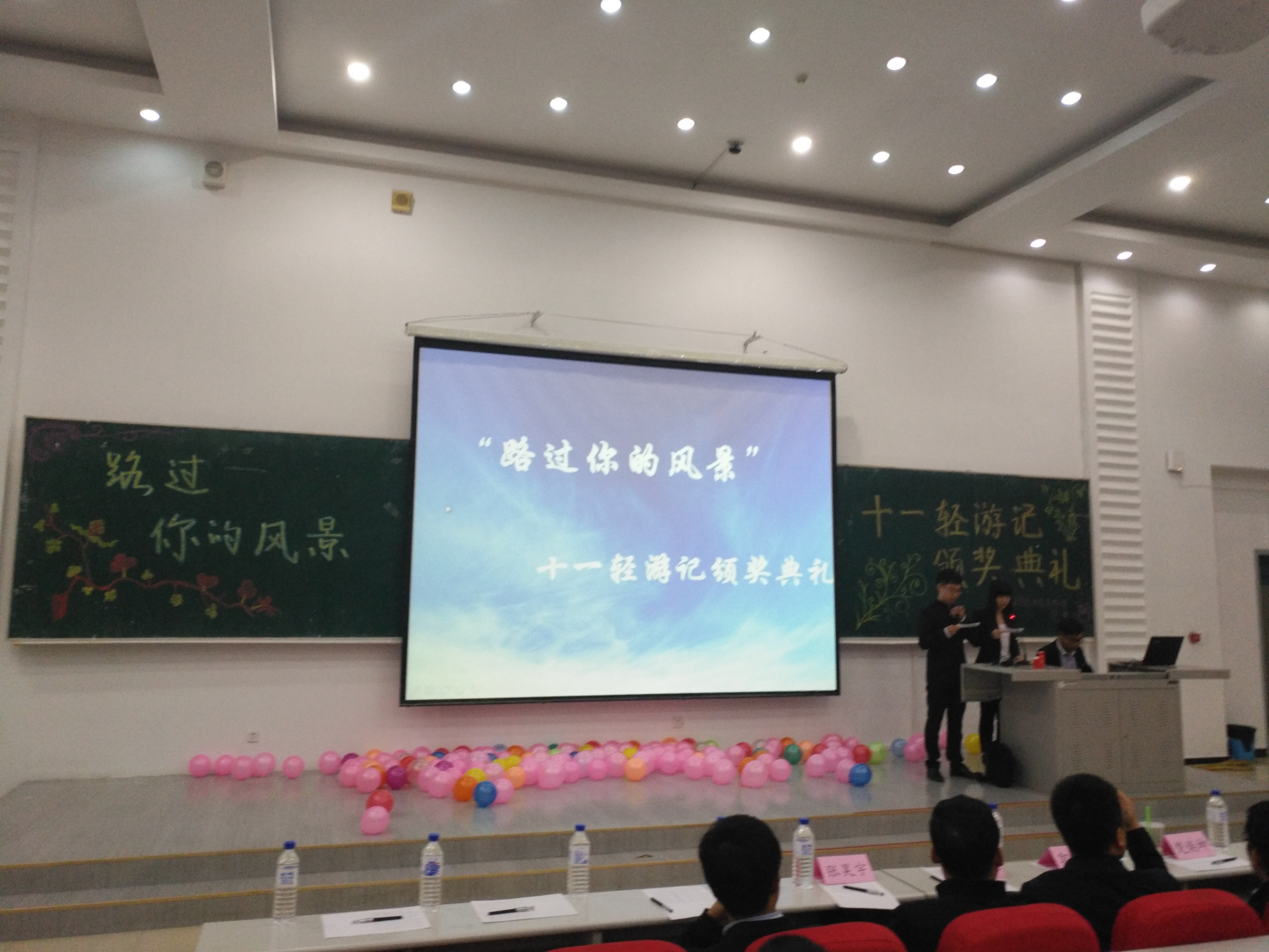 20161016日晚六点三十分,由地探公司、​哈哈体育、地科公司、环资公司、建工公司、商公司、经济公司多个公司主办的“路过你的风景”十一轻游记最终评审以及颁奖典礼在布置会场、彩排等多项安排后顺利在经信F5举行。公司郝雨竹、单婉盈、陈亦楠三位同学作为参赛选手参加了此项活动,另外,15级辅导员张昊宇老师以及多位其他公司老师到达现场参与评选。活动期间,十五位参赛选手对各自的作品进行了生动形象的描述,描绘了各式各样的或优美或壮丽的富有特色的风景,讲述了拍摄的时间、情景以及自己在十一旅游期间的感受,让在场听众仿佛身临其境,沉浸在照片中风景的世界里。随后,主持人对活动的赞助方日新楼美奈映像证件照专门店进行了简单的介绍。