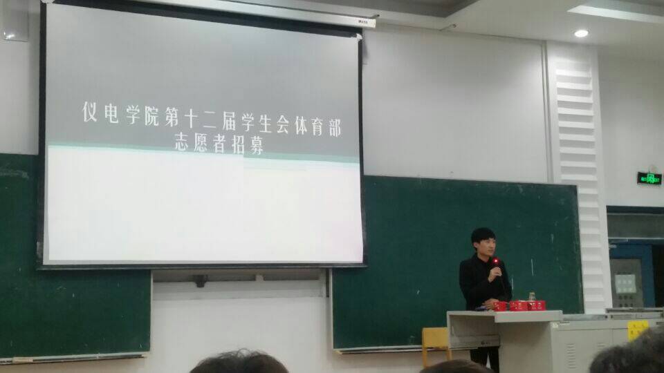 26日晚5点,体育部见面会在经信教学楼F9阶梯教室举行。首先,部长孟金对各位副部长的加入表示了欢迎,其次,部长与各位副部长依次进行了自我介绍增进了彼此的了解,最后,部长对体育部近期的工作任务进行了简单的总结与指导,5点40分,见面会议圆满结束。晚6点,公司志愿者招募大会如期召开,大会上,部长进行了精彩的志愿者招募宣讲,大会结束后,体育部开始进行志愿者面试,最终从诸多面试者中选出了十位较为优秀的员工作为志愿者。