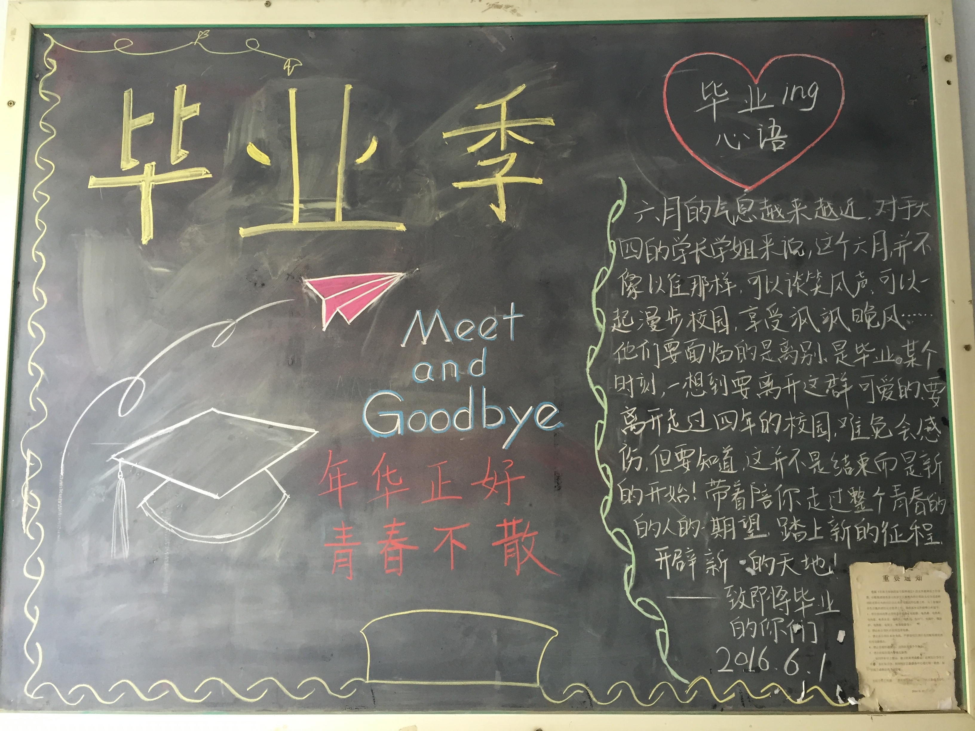 为迎接毕业季的来临,并为同学们创造优雅舒适的公寓环境,HAHA体育哈哈体育团委于2016年 6月1日15:00在朝阳校区一、二、五员工公寓开展了绘制“毕业季”主题黑板报活动,公司在校生代表参与了本次活动。