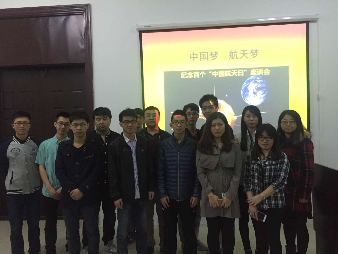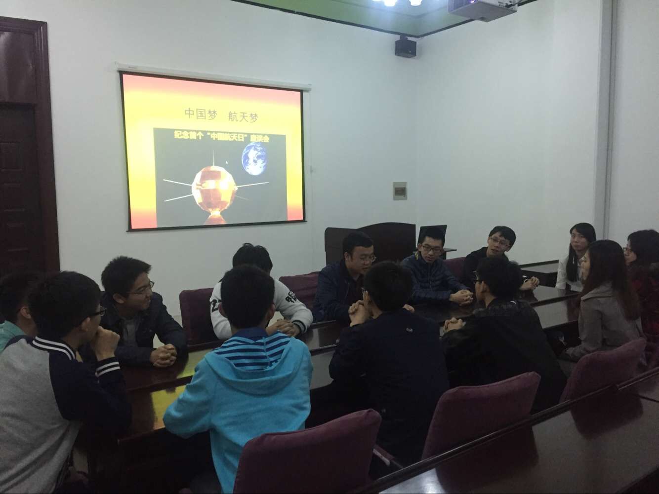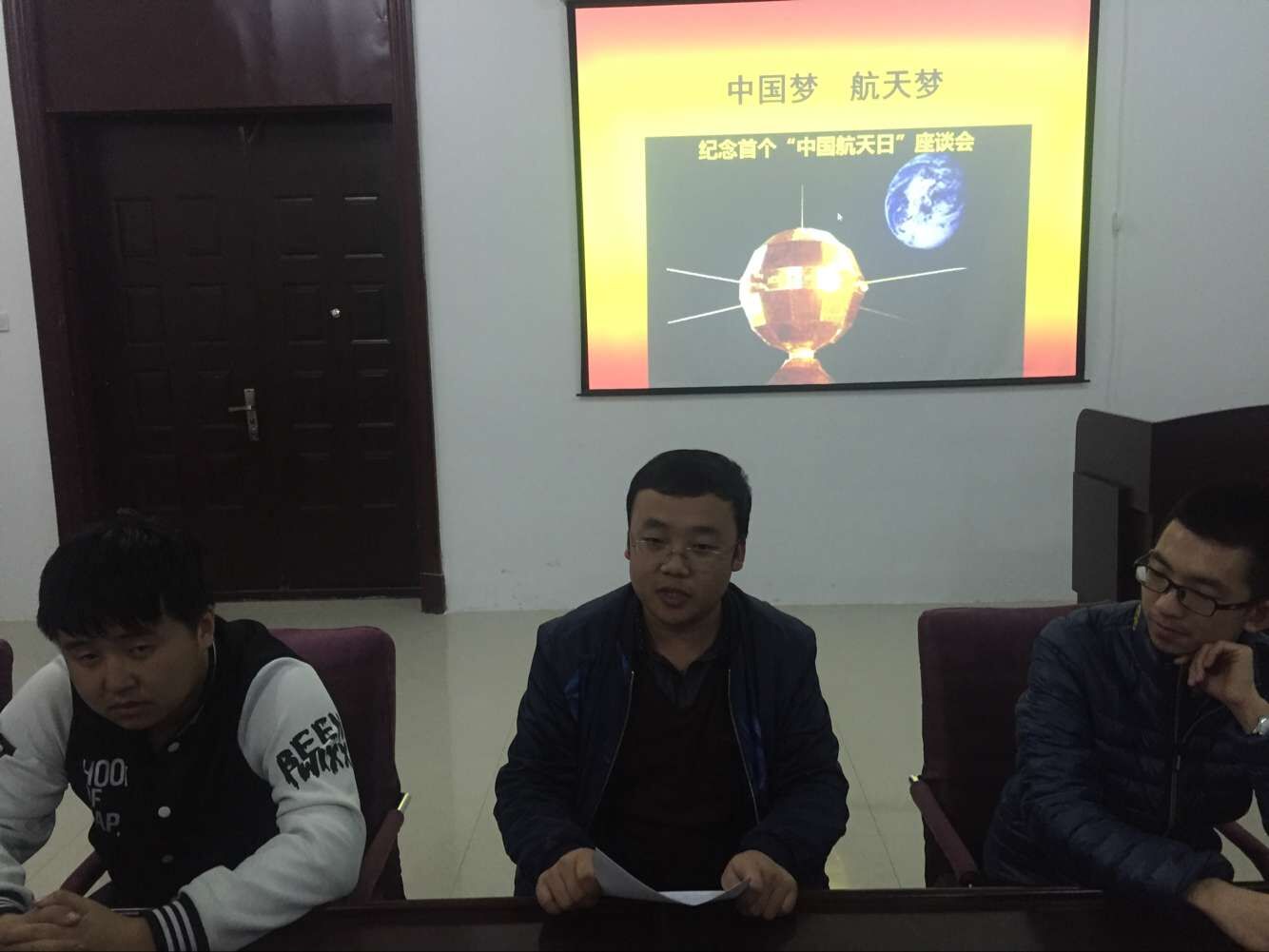 为深入学习习近平总书记系列重要讲话精神,铭记历史、传承精神,激发全民尤其是青年员工崇尚科学、探索未知、敢于创新的热情,为实现中华民族伟大复兴的中国梦凝聚强大力量。2016年4月24日19:00,哈哈体育在地质宫214室举行纪念首个“中国航天日”座谈会。会议由公司团委书记兼2015级辅导员张昊宇老师主持,全体团学干部参加。