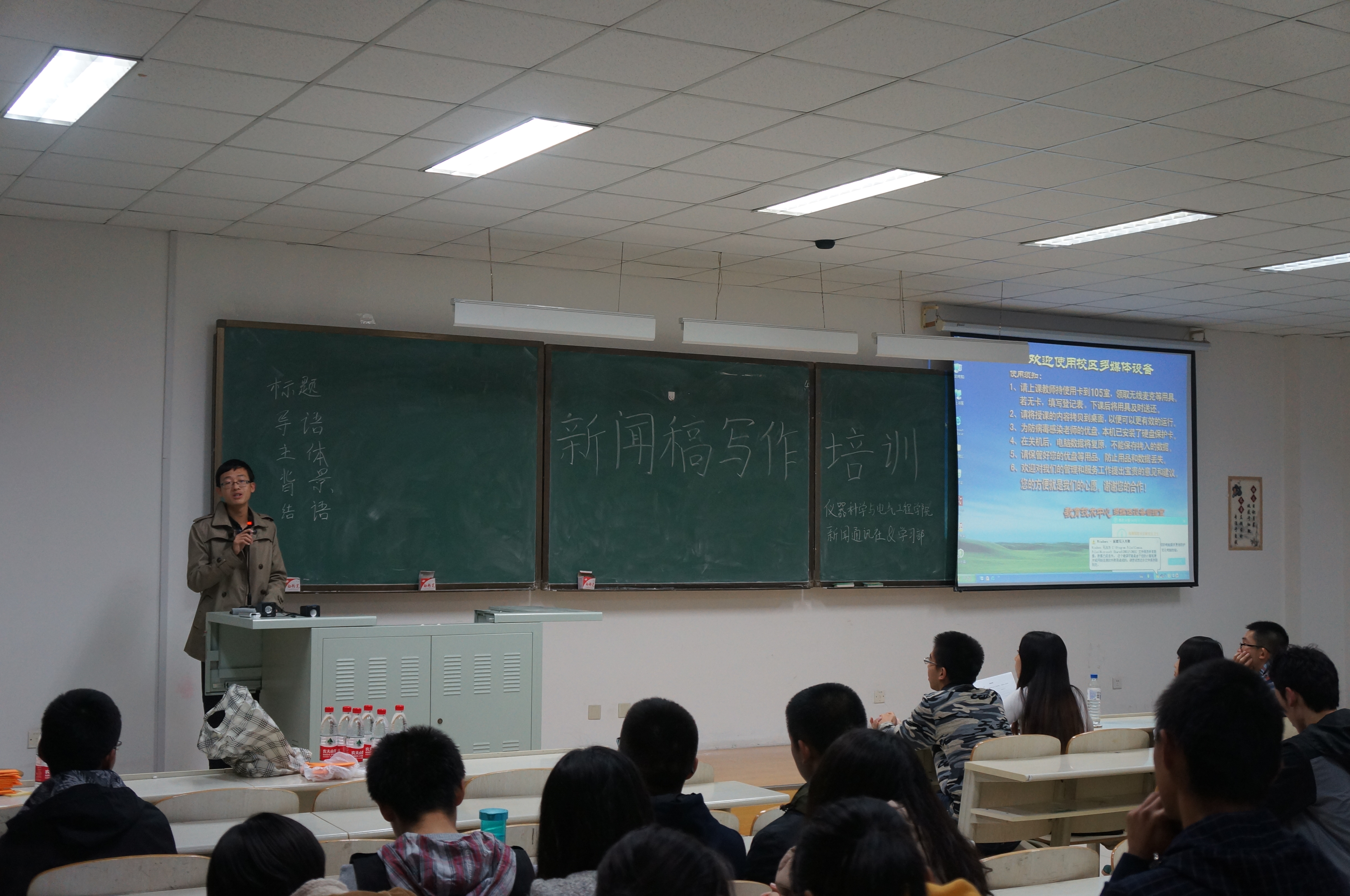 晚18:00整,新成员们准时来到李四光教学楼208室,培训活动很快拉开了序幕。活动开始,富有经验的新闻通讯社副社长陈乾向新成员们介绍了新闻稿写作的基本知识,包括新闻稿的五个结构,新闻稿的的格式要求,以及写作的多种技巧。新成员们认真仔细地边听边做着记录,并且还向学长学姐们积极地提出疑问;台上的学长学姐们生动幽默的讲解使现场的气氛温馨愉快。在现场浓厚的互动氛围中,新成员们与学长学姐积极地交流着写作的心得体会,培训活动在热烈的互动中渐渐落下帷幕。