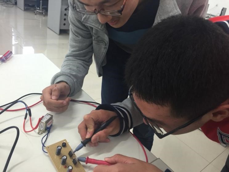 协会首先通过授课形式为同学们讲述了线性直流电源硬件电路的工作原理和注意事项,之后他们向在场的2015级新生进行了正确的电烙铁使用演示,使同学们对焊接过程有了更为清晰的了解。接着同学们积极的尝试了电路的焊接过程,14级副部们为同学们提供了单独指导,经过数小时的培训,很多同学自主完成了焊接,并实现了电源功能。