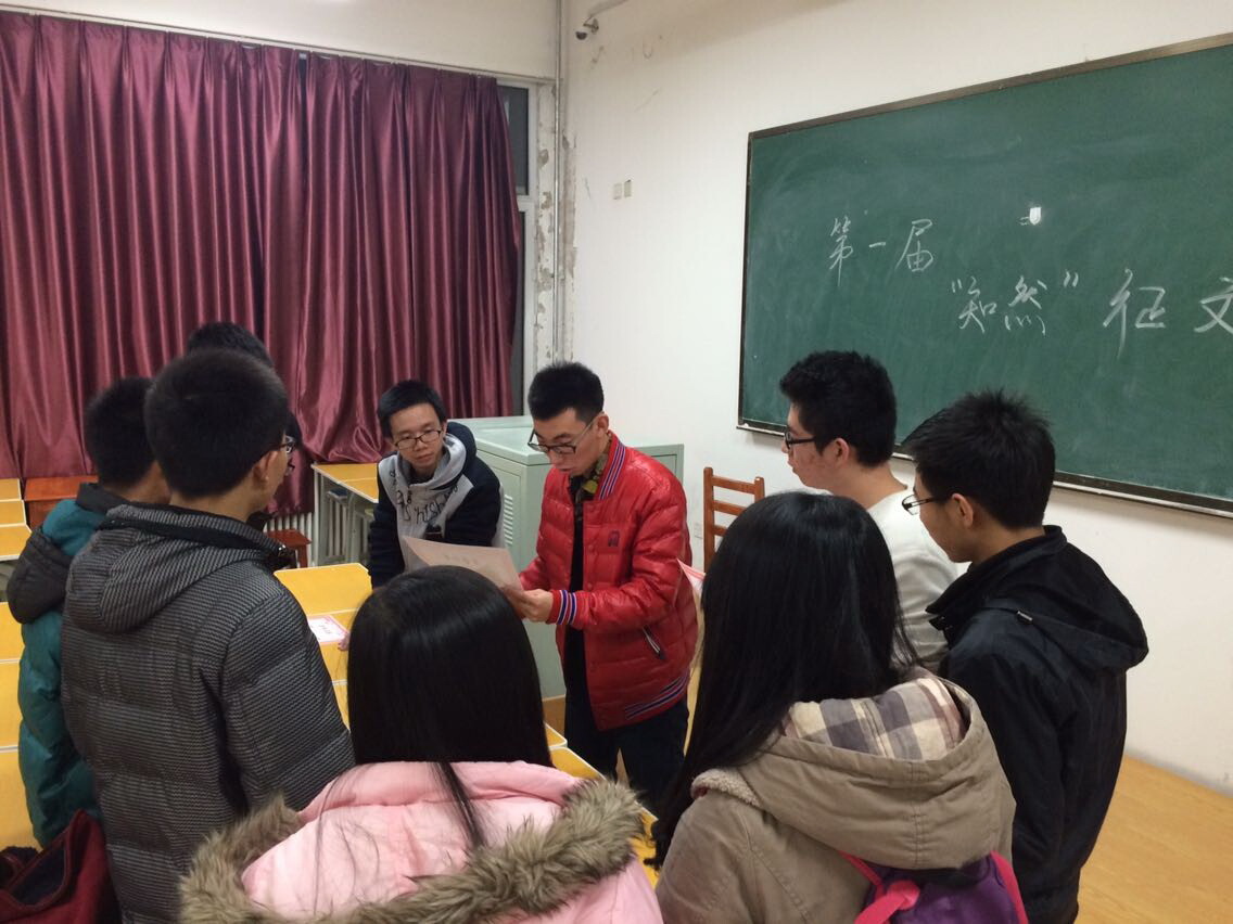 为深入贯彻落实党的十八届四中全会精神,践行社会主义核心价值观,同时为了进一步加强公司诚信校园文化建设,构建以诚信为荣的校园文化氛围,进而形成诚信明礼、勤俭节约的良好风气。公司筹办以“践行核心价值观,争做诚实守信好青年”为主题的系列活动,哈哈体育团委新闻通讯社于2014年4月18日在中心校区李四光楼308室举办了第一届“知然”征文比赛的颁奖典礼,公司全体员工会成员参加了本次活动。
