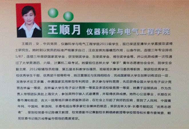 王顺月同学曾成功申请并完成国家级创新实验项目一项,带领团队参加英特尔嵌入式比赛获国家三等奖。连续两年获吉林省电子设计竞赛一等奖、校电子设计竞赛一等奖、挑战杯竞赛二等奖。基于竞赛研究成果,她还发表了学术论文两篇,申请实用新型专利两项;两次参加了国际学术会议,拓宽了她的国际学术视野。
