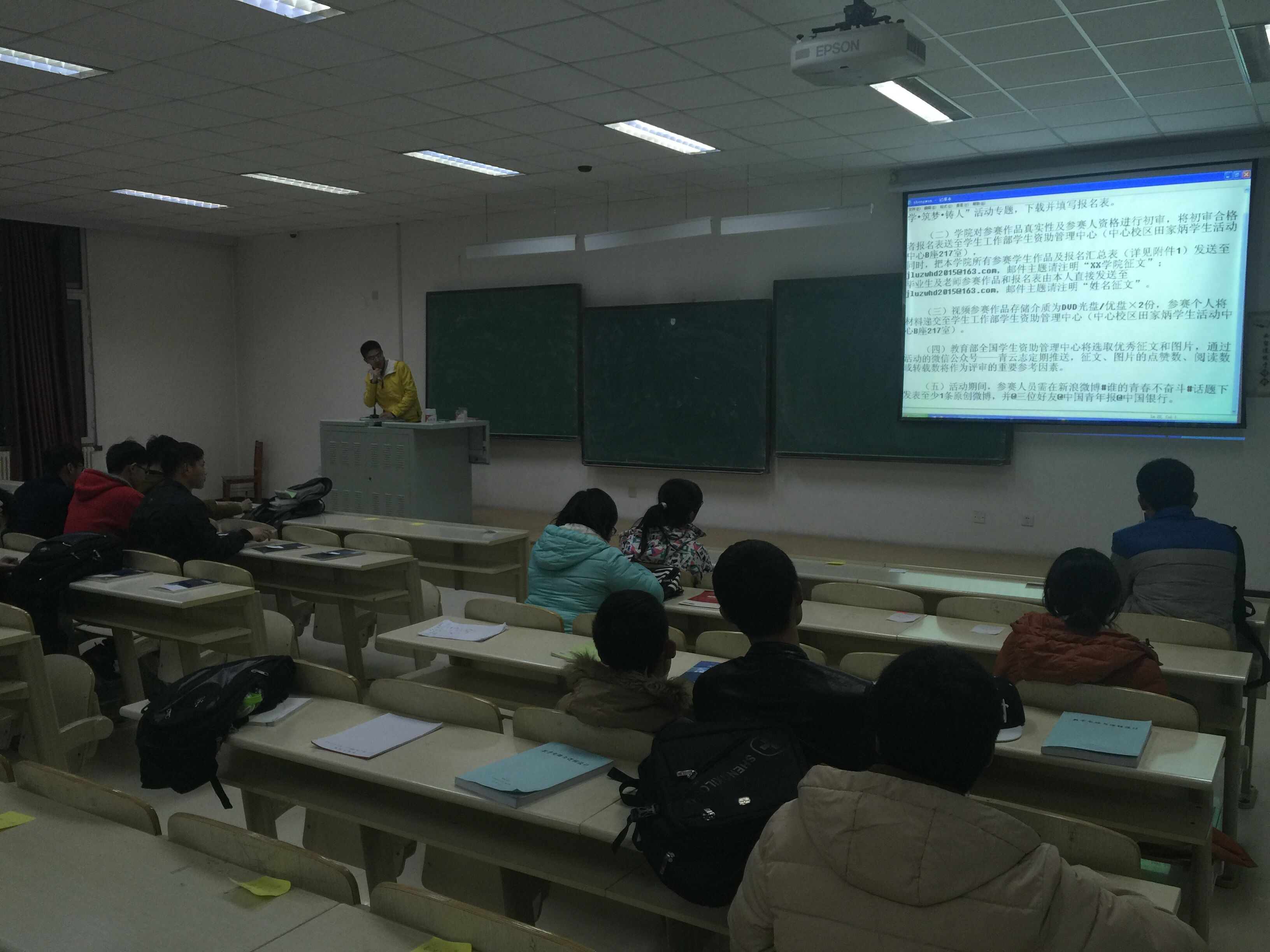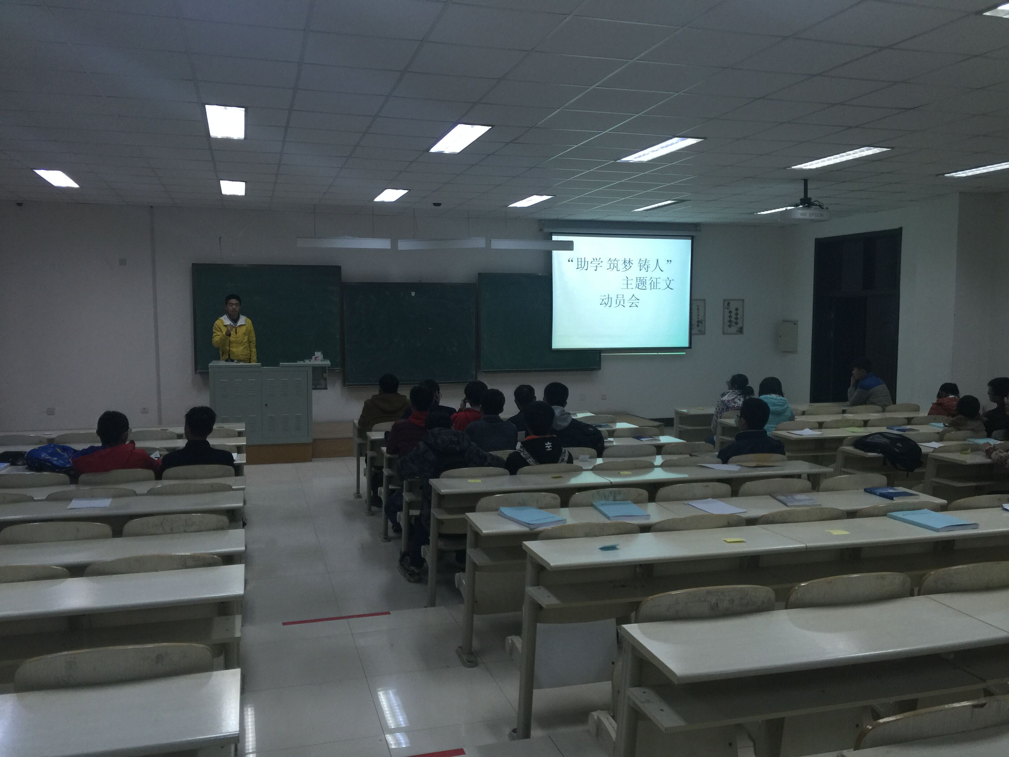 晚七时许,周琪部长就相关文件精神作详细介绍,并宣读作品主题、文字形式等相关要求。紧接着,他说道,此次征文大赛不仅可以宣传国家资助政策及成效,激励受助员工奋发自强、立志成才、感恩奉献,同时也为在座同学搭建了一个展示自我的平台,通过征文的形式,展现公司学子自强不息的精神。期间,他结合本次征文要求鼓励大家积极参与,踊跃报名,根据主题新颖立意、明确表达,书写法治精神内涵、描绘和谐校园风景。最后,他表示,希望在座同学以此征文比赛为契机,将这种精神落实到学习生活中,为构建和谐校园贡献出绵薄之力,并宣读本次活动口号:“中国梦•谁的青春不奋斗”。动员会议中,在座同学都聚精会神,并做好相应笔记,纷纷表示将会认真对待此次征文活动。
