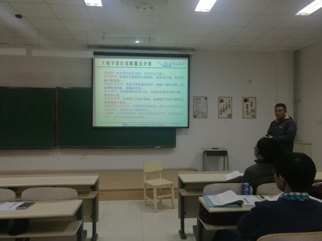 首先,周志坚老师向2016级同学讲解了《电子设计基础(模拟部分)》第一章的内容。周志坚老师通过类比数字电路与逻辑设计及电路分析基础这两门课程中学到的内容,为大家讲解了信号及放大电路的相关知识,参加培训的同学认真听讲,积极回答讲授过程中老师提问的问题。接下来,周志坚老师讲解了模电知识在电子设计大赛中的应用,同时还给同学们分享了许多准备电子设计大赛的小技巧,老师用幽默风趣的语言为大家讲授了知识,也激发起了同学们对模电学习的积极性。短短的两节课在轻松的课堂氛围中过去了,通过周志坚老师的讲解,同学们学习到了模电的基础知识,同时还掌握了模电知识的应用领域。