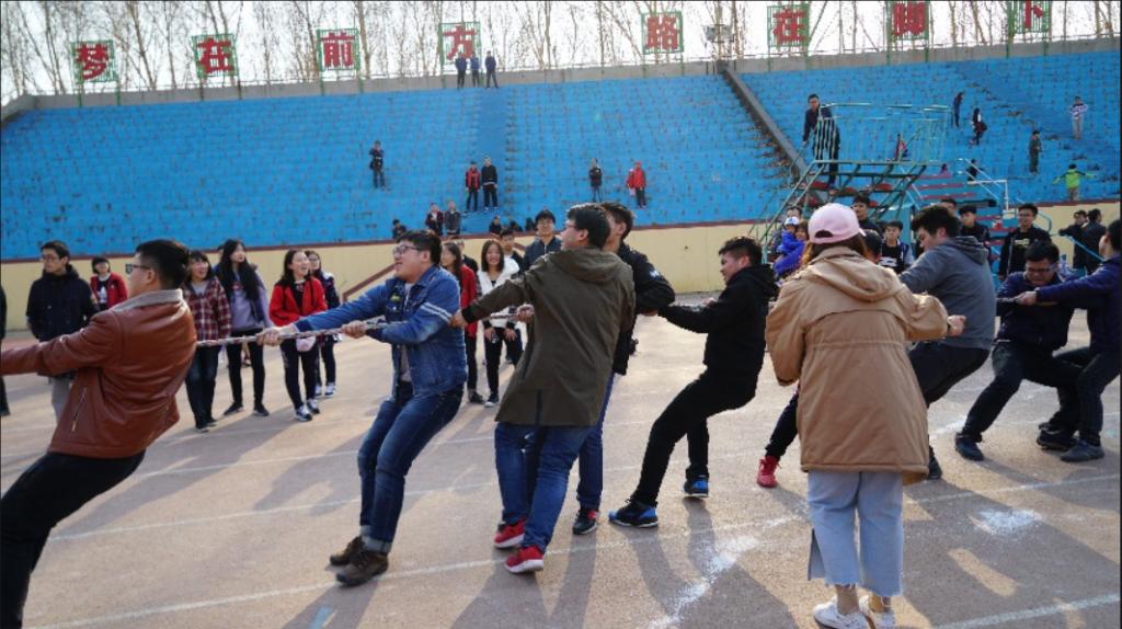 活动伊始,各班级负责人组织同学有序站好,开始热身活动,为接下来的各项活动做充分准备。为增加活动趣味性,指挥人员设计了相应惩罚环节,调动同学们的积极性。第二项进行的是是跳绳比赛。本项活动对各班参赛人数不设限制,只计算在规定五分钟时间内的跳绳次数,并依据积分进行排名。由于活动的竞技性较强,同学们竭尽全力,在运动场上挥洒汗水。接下来,我们迎来了踩气球比赛。比赛中各班同学进入场地,互踩气球,活动现场充满了欢快的笑声。十分钟后计算各班剩余气球数,并进行排名积分。随后进行拔河比赛,我们采用一局定胜负制度。各班通过抽签选择对手,两两进行比拼,逐级比拼,最终决出优胜班级。各班参与拔河的同学齐心协力,场外观众也呼喊加油助威,比赛十分精彩。最后一项活动是扑克比赛。各班级代表队依次上前抽取志愿者面前的扑克牌A-K,用时最少的班级获胜,并进行积分排名。至此,素质拓展活动比赛部分结束,工作人员统计各班总分,进行公示,并由颜培荣同学为获得前三名的班级进行颁奖。
