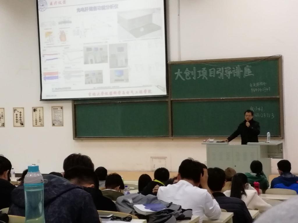 首先千承辉老师对大创项目的流程进行了简要介绍,强调了大创项目的申请条件。随后引导讲座切入正题,王智宏老师介绍了她的研究方向:光谱技术、精密测量技术、快检技术、重力感应技术和机器人方向,之后又对她的两个大创项目:“地面自动寻位全量程辐射定标装置”和“基于细分的电压/电流高精度检测系统” 进行讲解,在比较容易出现疑问的部分,老师以图解的方式带领同学们一起思考,加深了大家对项目的理解,使员工们收获匪浅。接着王世隆老师介绍了自己的课题:“基于飞行平台的软硬件设计需求”,分别从时空域航空电磁探测仪器系统研发的直升机平台和多频复信号电磁探测仪器系统研发的无人机平台两个方向全面讲解了飞行器平台的原理和设计理念,并表示很愿意吃苦耐劳、勤奋努力的员工加入他的团队。随后蔡靖老师登台,介绍了刘光达老师带队的医学仪器特色的大创项目:穿戴式人体生理参数检测仪器、光电肝储备功能分析仪、EEG-NIRS脑机接口与疾病检测以及人体微信号检测算法,从人体运动科学、运动生理学和运动医学层面上详细解释了各个项目的内容和未来研究方向,蔡靖老师以趣味性的讲解引来同学们的阵阵掌声,将引导讲座的气氛推向高潮。在同学们的掌声中,接着随阳轶老师走上讲台直入主题,讲述了自己的项目:“守护颈椎的智能眼镜”和“机器鱼的磁干扰补偿研究”,以通俗易懂的语言分析了这两个项目的研究内容,并且将较难理解的机器鱼项目类比无人机的相关模块进行详细介绍。之后,介绍了以地学部地学特色为主的“磁共振地下水探测”项目,又给同学们提供了一个新的选择。整个引导讲座过程中,千承辉老师也不时参与进来,提出自己的看法。
