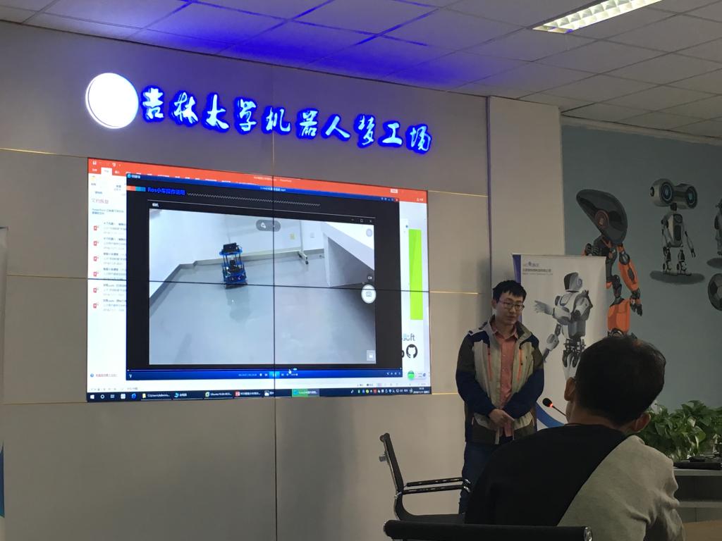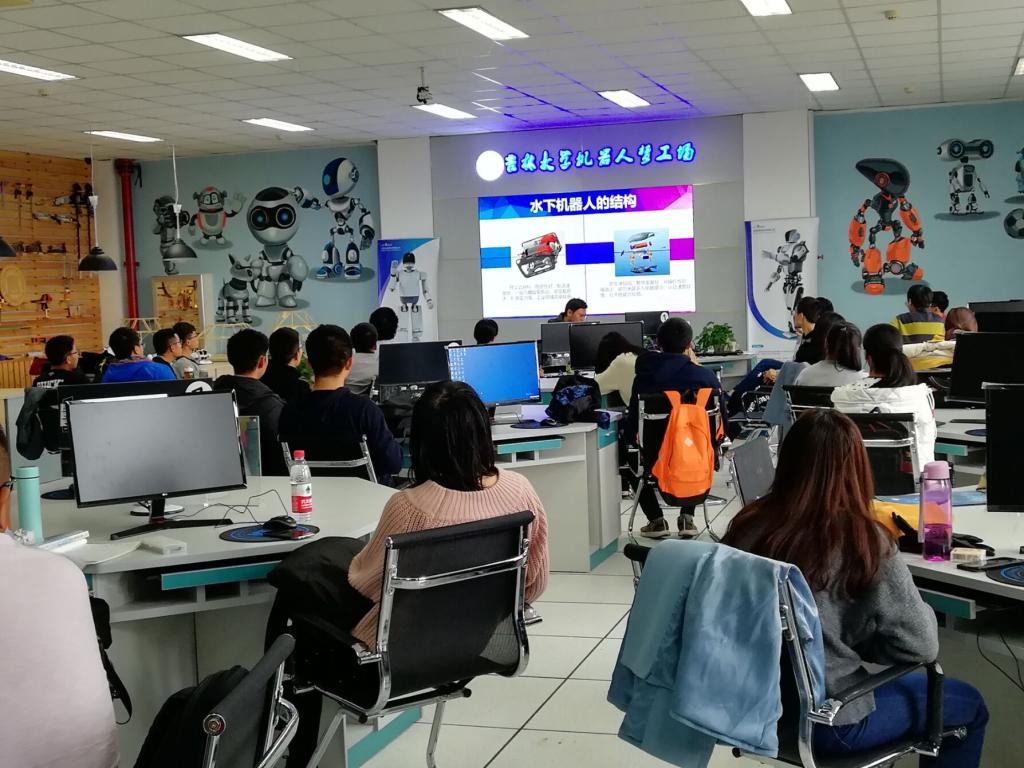 实战比赛视频拉开了活动序幕。伴随着同学们热烈的掌声,王浩帆同学首先对水中机器人的定义进行了介绍,并同时结合国内外水中机器人发展趋势向同学们简单讲解了水中机器人的分类。随后,陈冠桥同学向在场的同学们展示了水中机器人中的一种——博雅工道机器鱼,并结合实物向同学们简单剖析了该款机器鱼的结构特点。俗话说:耳听为虚眼见为实。紧接着,伴随着同学们期待的目光,付强同学通过计算机向同学们演示了机器鱼的视频采集和色彩识别功能。最后,王浩帆同学向同学们介绍了水中机器人的参赛种类并同时讲述了水中机器人的实战经验。在介绍完水中机器人后,陈金龙同学接过话筒,向同学们讲解贴近日常生活的服务型机器人。他首先介绍了该种机器人最核心的部分,即ROS机器人操作系统。这种与其他机器人不同的操作方式很快便吸引了同学们的目光。空有操作系统没有程序也不足以使机器人系统运作起来,其次陈金龙同学便讲解了使用ROS机器人系统所必备的编程语言。接着,他又向同学们阐述了该机器人需要做什么,并结合实际比赛,向同学们讲解了竞赛规则以及评分标准。