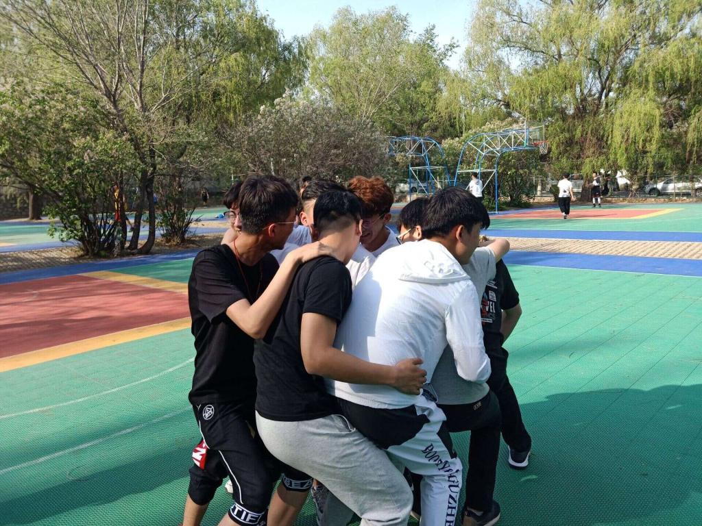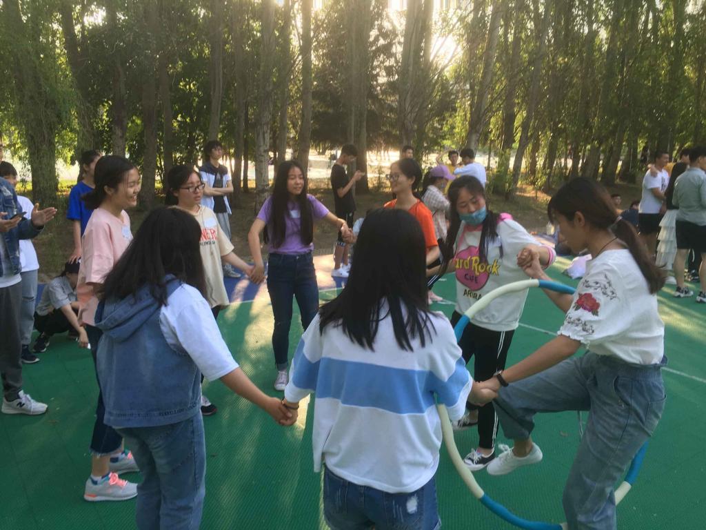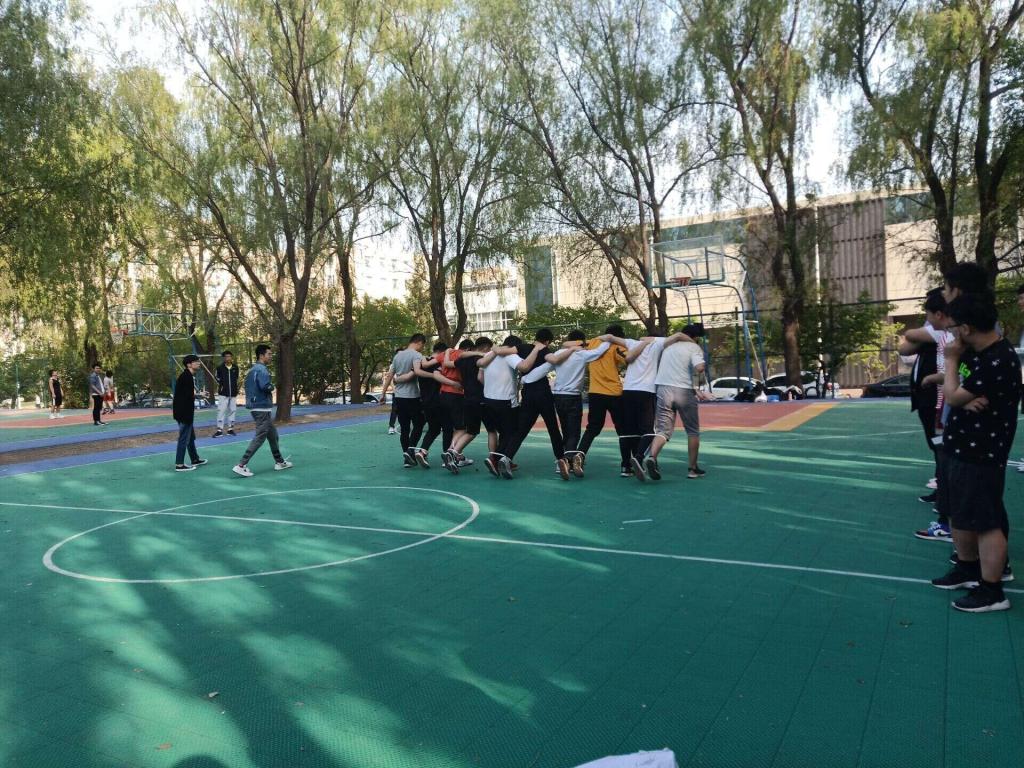 活动当天正值初夏,虽然天气炎热,但同学们情绪依然十分高涨。各方阵同学在篮球场集合后,负责人组织同学们有序站好,开始热身活动,使大家放松心情,为接下来的各项游戏做好充分的准备。首先,各方阵分别进行123看着边、引路人、传篮球、解手链和人椅破冰几个游戏项目,每一个项目都是对同学们综合素质的考察。123看这边游戏增强了对同学们的反应能力和应变能力;引路人游戏不仅加强了同学们的语言表达能力,还加深了同学们对彼此的信任;而传篮球游戏使大家产生了强烈的集体责任感;解手链游戏展现出同学们的聪明才智;在人椅破冰游戏中,每一个人都十分重要,离开任何人的努力都无法完成游戏,这是对同学们团队精神的考验。经过这几个游戏,各方队的同学们拉进了彼此的关系,产生了强烈的团体意识,真正地成为了一个团队。