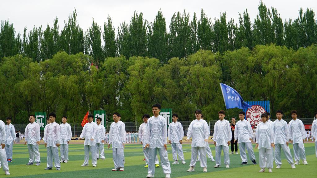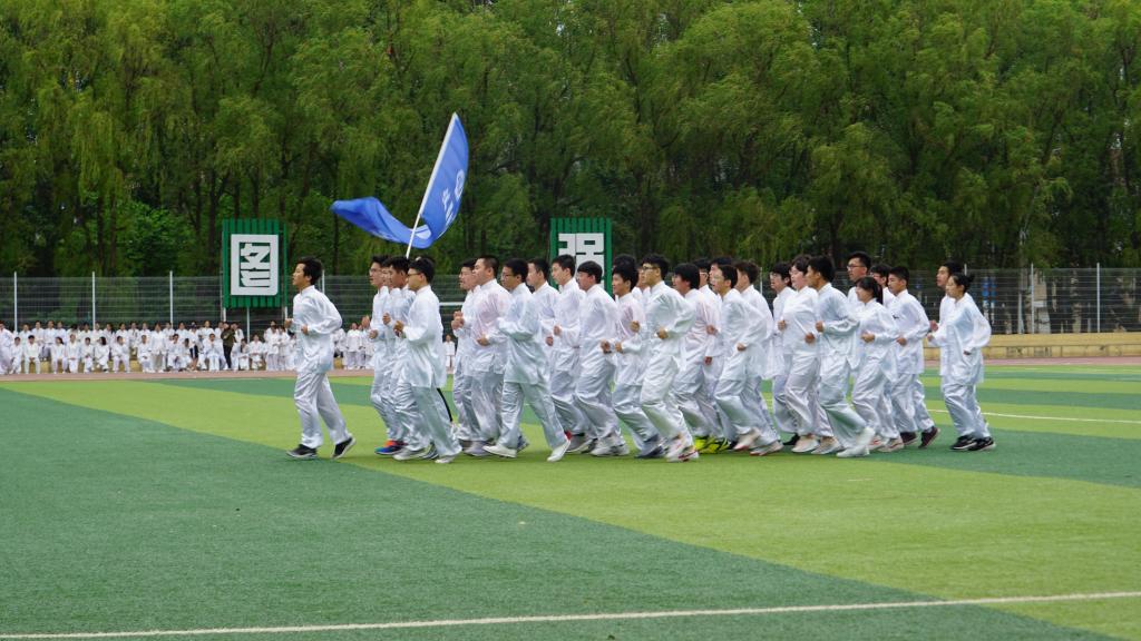 经过为期两周的培训,同学们已经能够完整熟练地完成整套太极拳,准备迎接比赛的到来。上午8:00,队员们在体育场内集合,回忆比赛流程和动作要领,做好赛前准备。​哈哈体育太极方队由32名队员和一名旗手组成,随着入场口令的下达,方队踏着整齐的步伐,喊着响亮的口号进入场地中央。在舒缓的音乐中,同学们动作舒展大气,节奏稳健,队伍整齐划一,充分展现了太极的柔和之美。