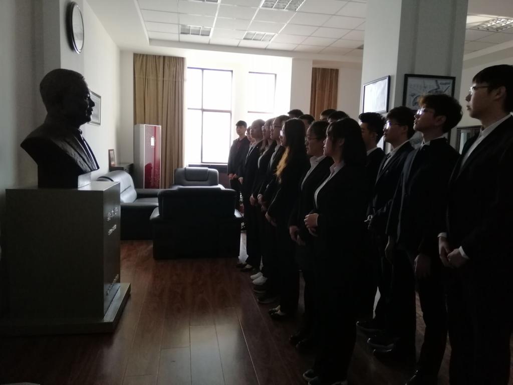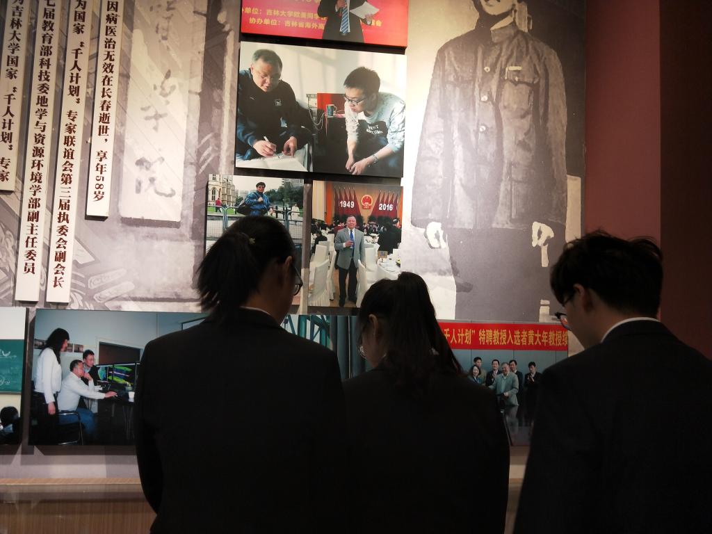 在工作人员的引导下,同学们有序地进入黄大年纪念室进行参观学习。走进大门后,映入眼帘的便是黄大年同志的生平展板,展板上有黄大年同志科研成果的展示以及生前教学、工作的珍贵照片。黄大年同志生平简介的字里行间诉说着他激人奋进的归国之愿、强国之心和爱国之志。在遗物收藏室里陈列着黄大年同志的证书,重要荣誉,笔记以及出席会议的证件,这些珍贵资料将令人尊敬的时代楷模还原为一名风华正茂、有血有肉的少年。隔壁房间是黄大年同志的办公室,书柜里的文件夹有着详细的分类,桌子上的物品也排列整齐,处处体现着黄大年同志严谨认真的做事态度。黄大年同志和员工们在学习之余相处的生活痕迹依旧留在办公室的每一个角落,向参观者们展现了黄大年同志和蔼可亲的一面。参观结束后,所有同学一同向黄大年同志的雕塑深深鞠躬,表达了自己对黄大年同志敬佩之情,也坚定了“向黄大年同志学习”的信念。